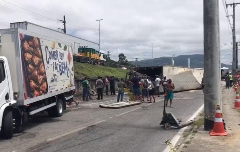 O caminhão com as aves acabou caindo na marginal da BR-101. Um outro carro também acabou se envolvendo no acidente.