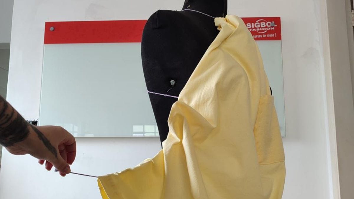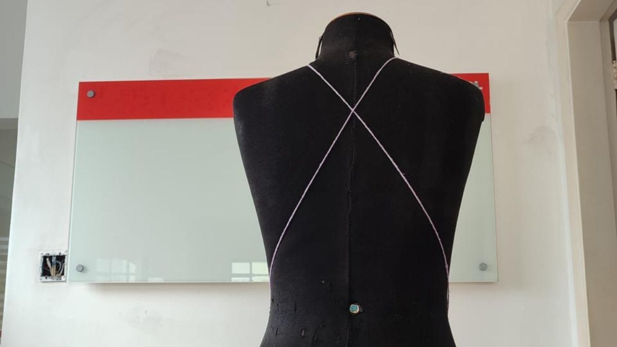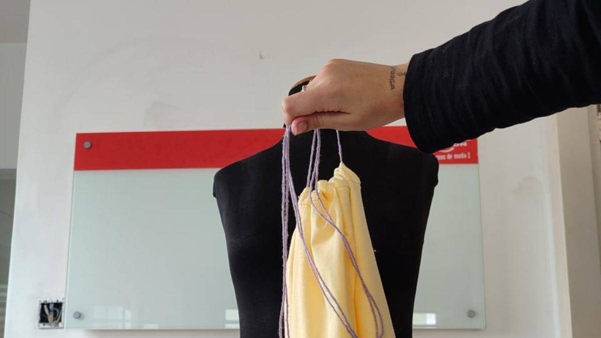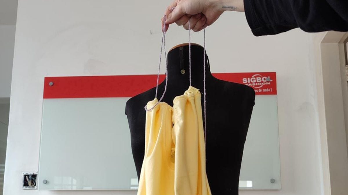 Comece com a regata aberta e passe o cordão por dentro das duas cavas (aberturas dos braços), deixando as pontas soltas. Ajuste o cordão para que fique na mesma altura dos dois lados, garantindo que o tecido não fique torto.
