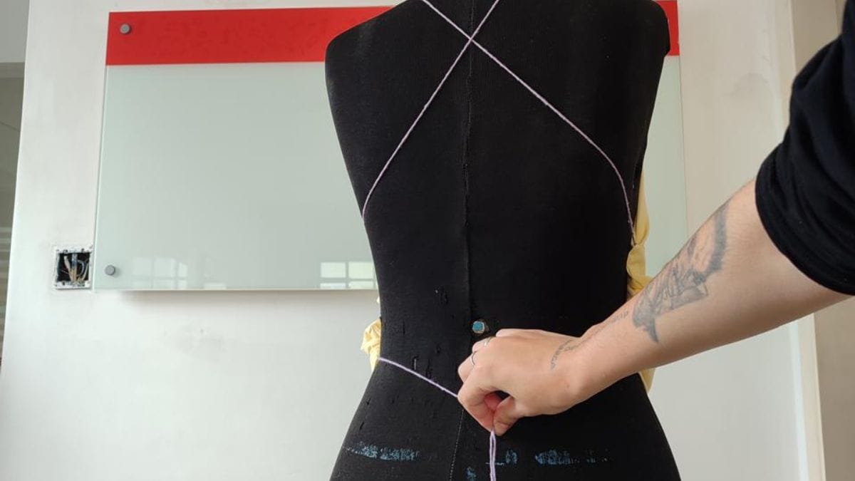 Repita o mesmo movimento do outro lado, mantendo o tecido bem distribuído. Amarre as pontas do cordão nas costas, ajustando a firmeza conforme o corpo.
