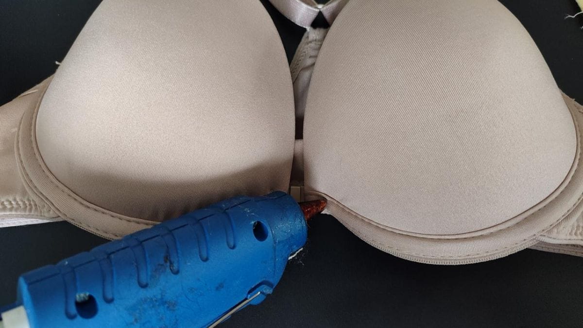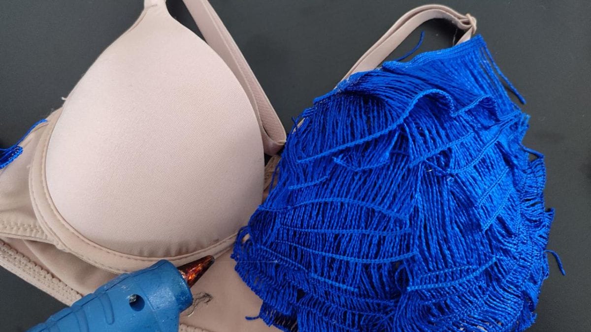 Comece pelo busto do sutiã. Aplique a cola quente na parte inferior e cole a franja de baixo para cima, formando camadas sobrepostas para dar volume e movimento.