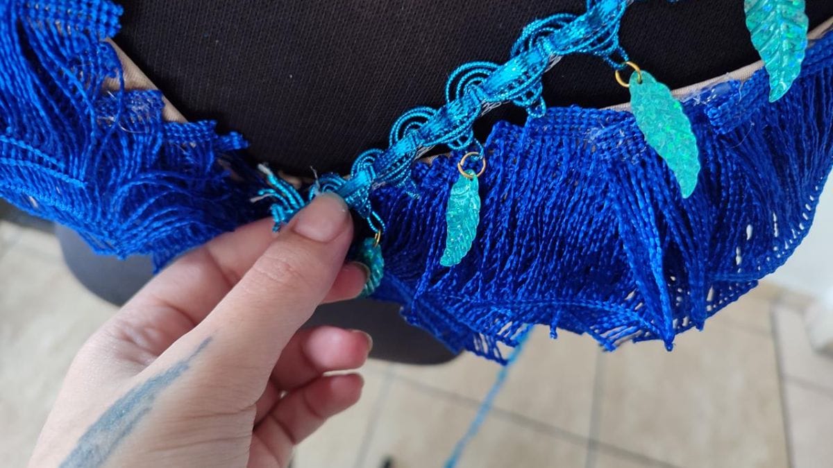 Com as franjas já coladas, utilize a passamanaria com paetês para dar acabamento, colando ao redor da base e da parte superior do busto. Leve a passamanaria até as alças do sutiã para um visual mais elaborado.