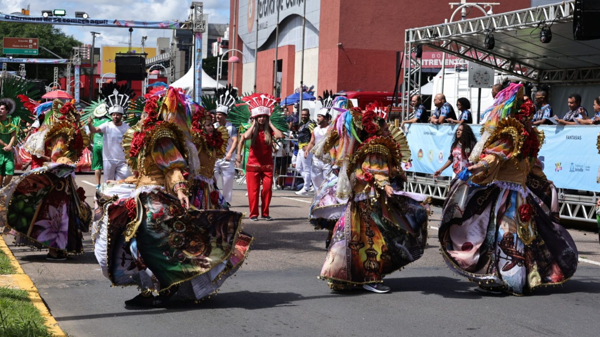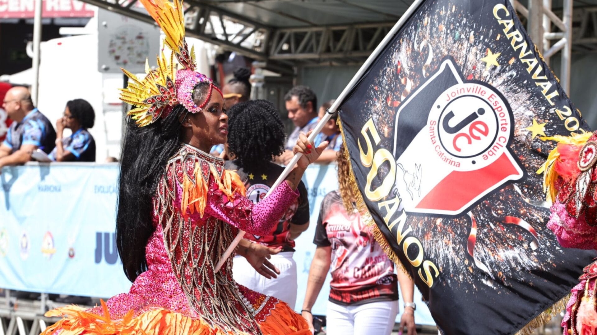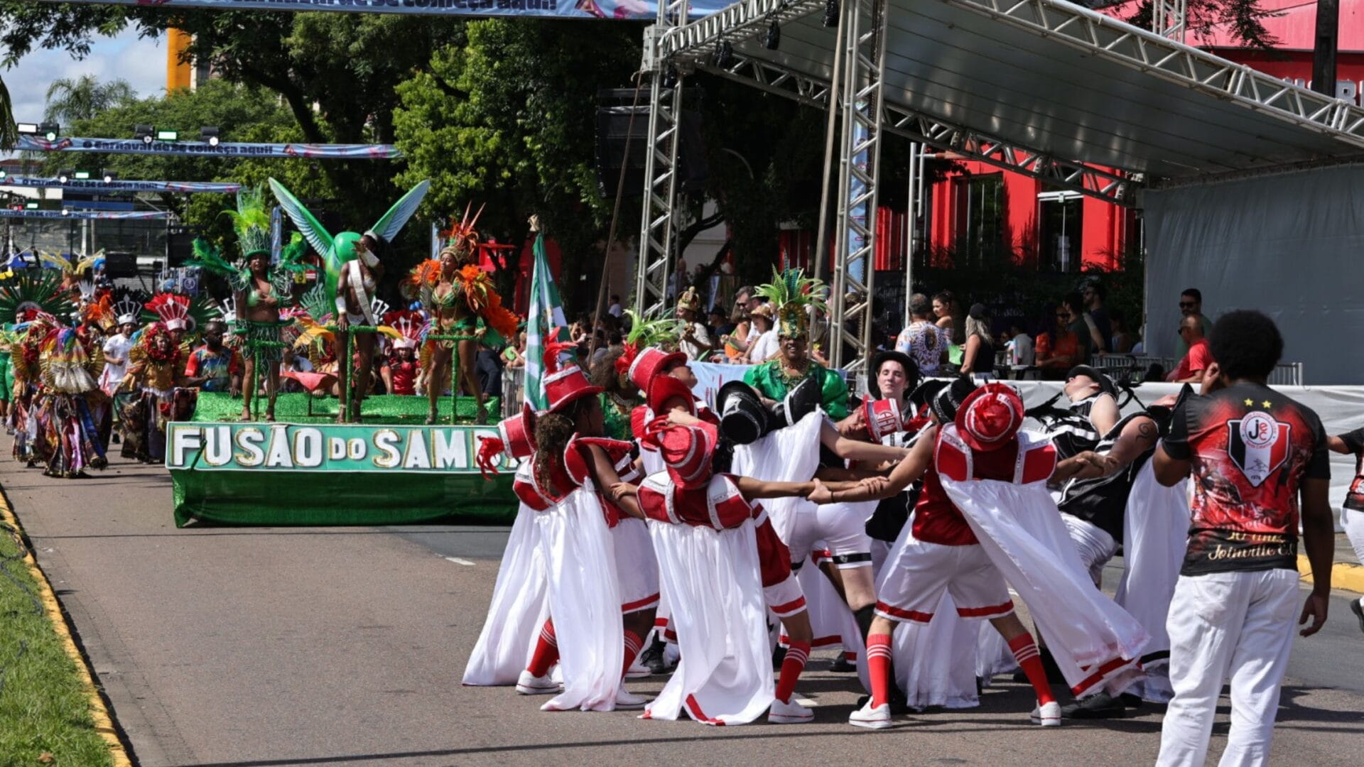 As cores do tricolor joinvilense foram as primeiras a tomar conta da avenida por volta das 9h. A escola Fusão do Samba homenageou os 50 anos do Joinville Esporte Clube (JEC) e colocou as mulheres negras em destaque no desfile.