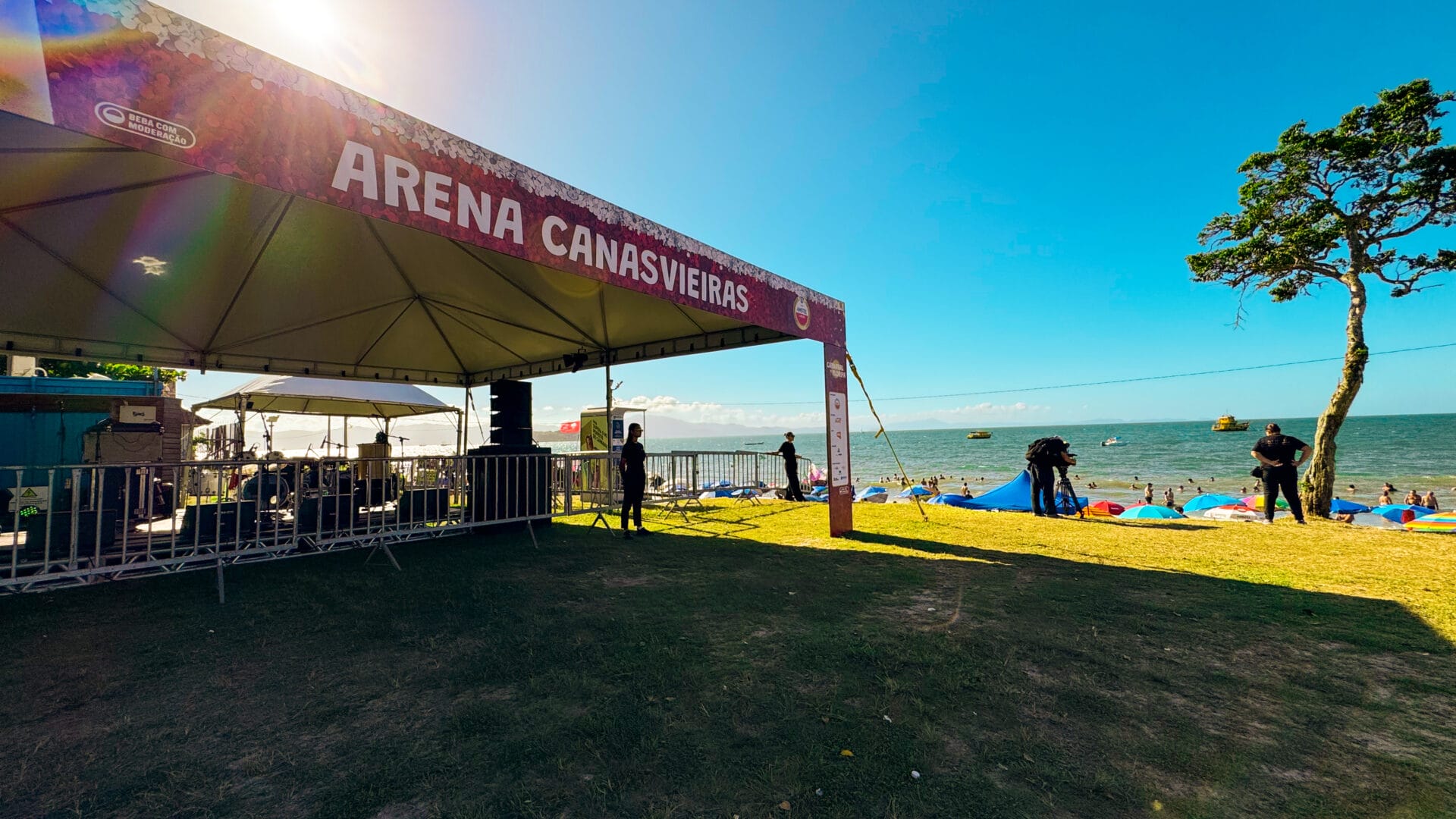 O mar azul e a programação desta segunda-feira (3) na Arena Canasvieiras, em Florianópolis, atrai o público para curtir o dia de sol na praia com muita música e diferentes atrações. A expectativa é que pelo menos 1.200 pessoas passem pelo espaço durante o penúltimo dia de evento da agenda de Carnaval.