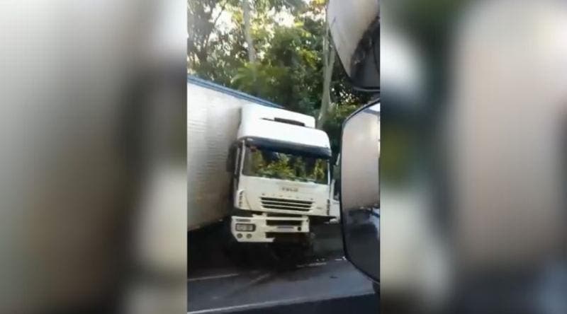 Uma carreta bateu contra uma barreira de concreto na manhã desta sexta-feira (18) na BR-376, que liga Santa Catarina e Paraná, e deixou o trânsito prejudicado no local. Com o impacto da batida, o veículo ficou em formato de “L” e foi parar no meio da pista, e provocando engarrafamento de quatro quilômetros.