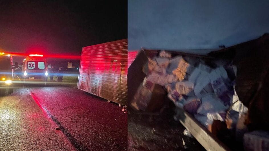 Uma carreta tombou no trecho Sul da BR-101, em Criciúma, na noite dessa quinta-feira (13). A carga de papéis higiênicos e fraldas ficou espalhada às margens da rodovia, próxima ao bairro Quarta Linha.