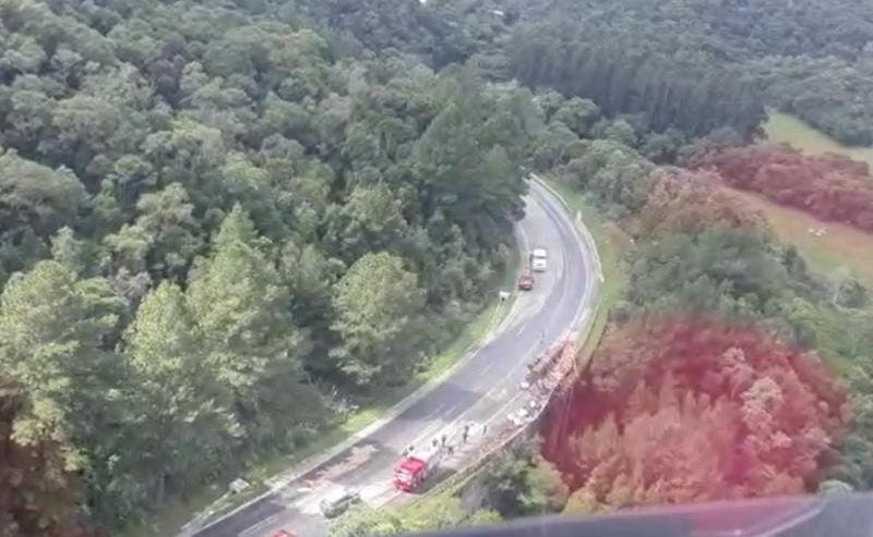 Uma carreta tombou na beira de um penhasco na BR-282, em Santo Amaro da Imperatriz, na Grande Florianópolis, nesta terça-feira (19). Segundo a Polícia Rodoviária Federal (PRF), o fluxo de veículos estava liberado por volta das 14h.