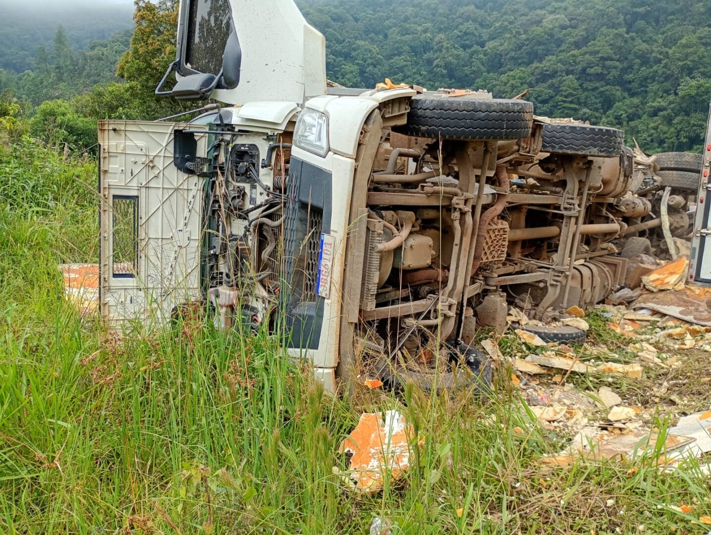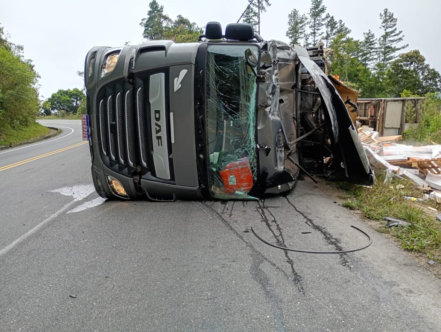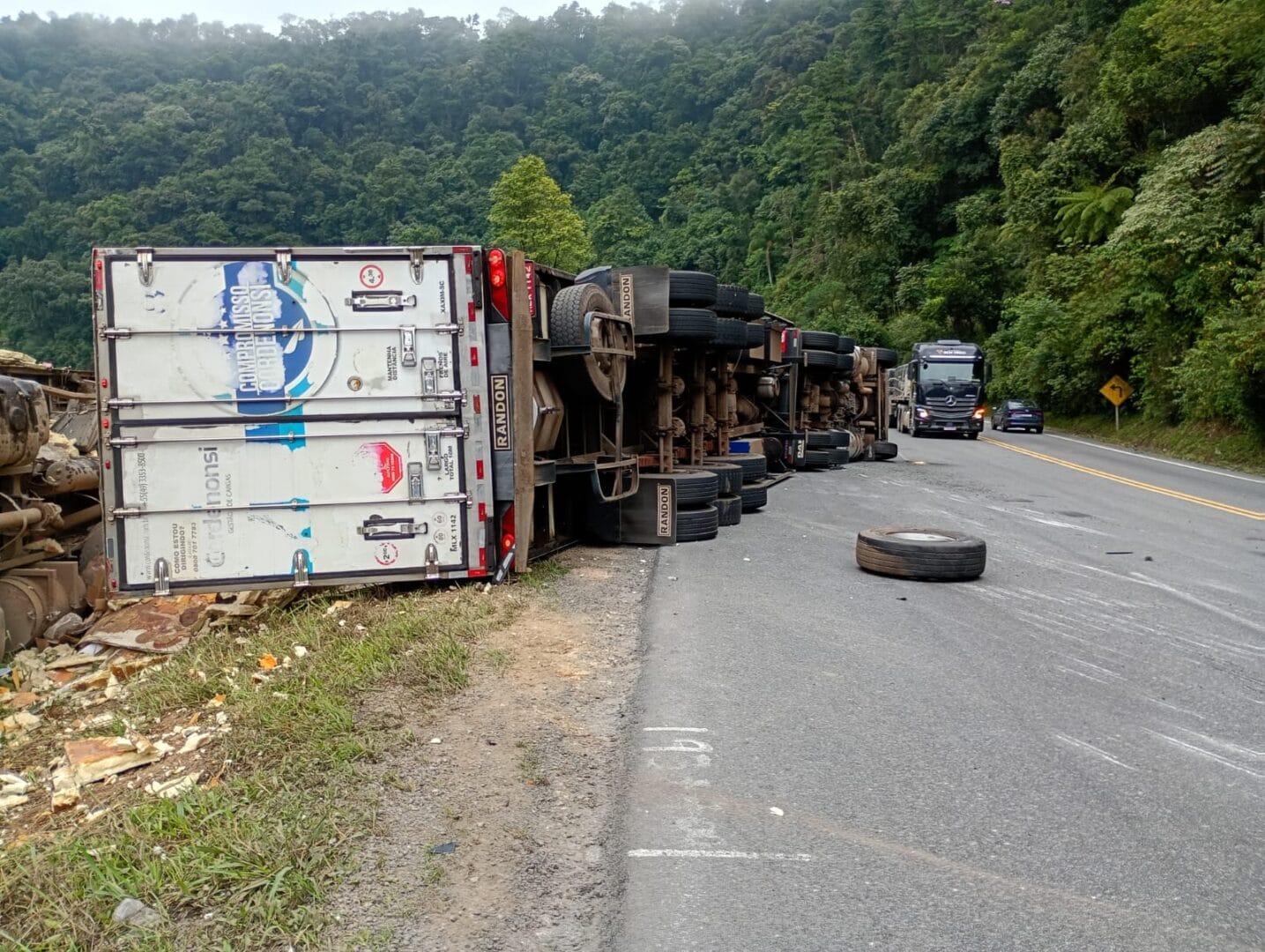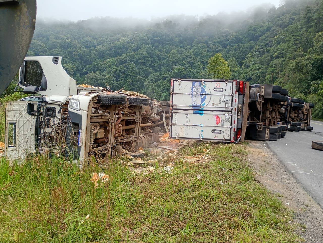 Duas carretas tombaram na BR-470 na manhã desta quarta-feira (18), na altura do quilômetro 193. Um dos veículos descia a Serra da Santa, em Pouso Redondo, quando atingiu a lateral de outro que estava subindo no sentido contrário. Por volta das 11h30min, o trânsito fluía normalmente, apesar do acidente, segundo informou a Polícia Rodoviária Federal.