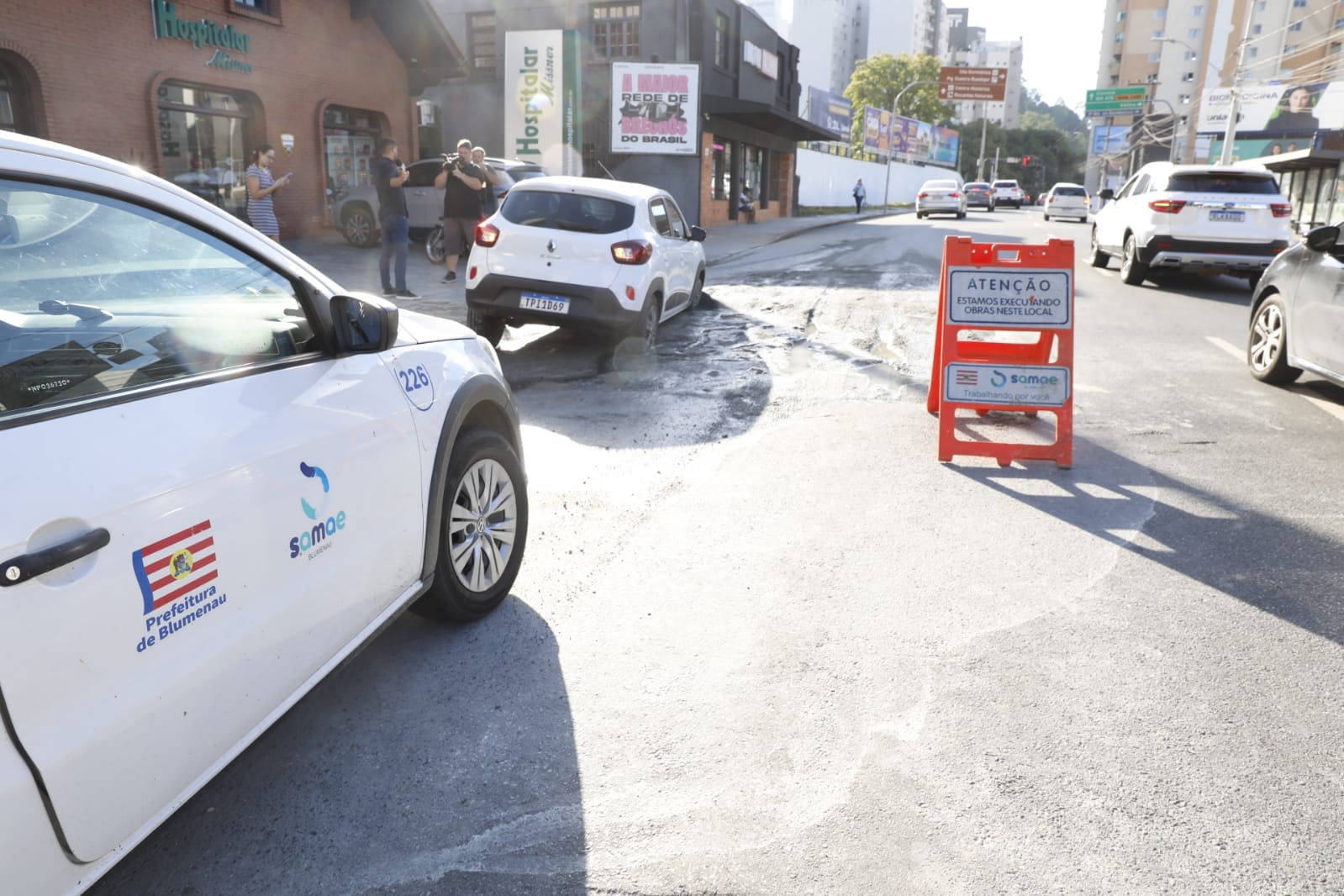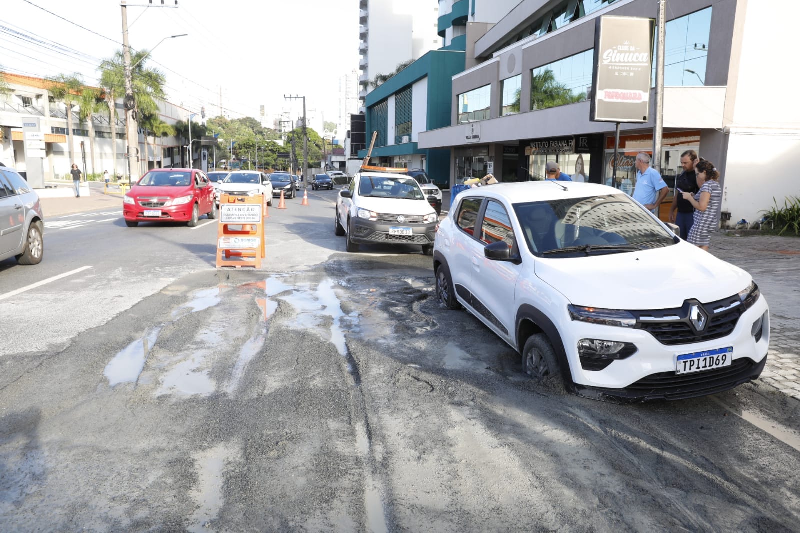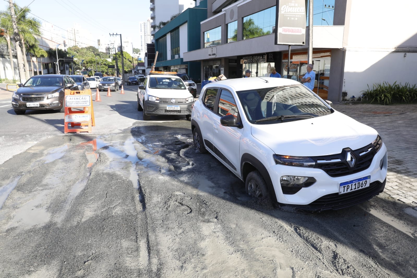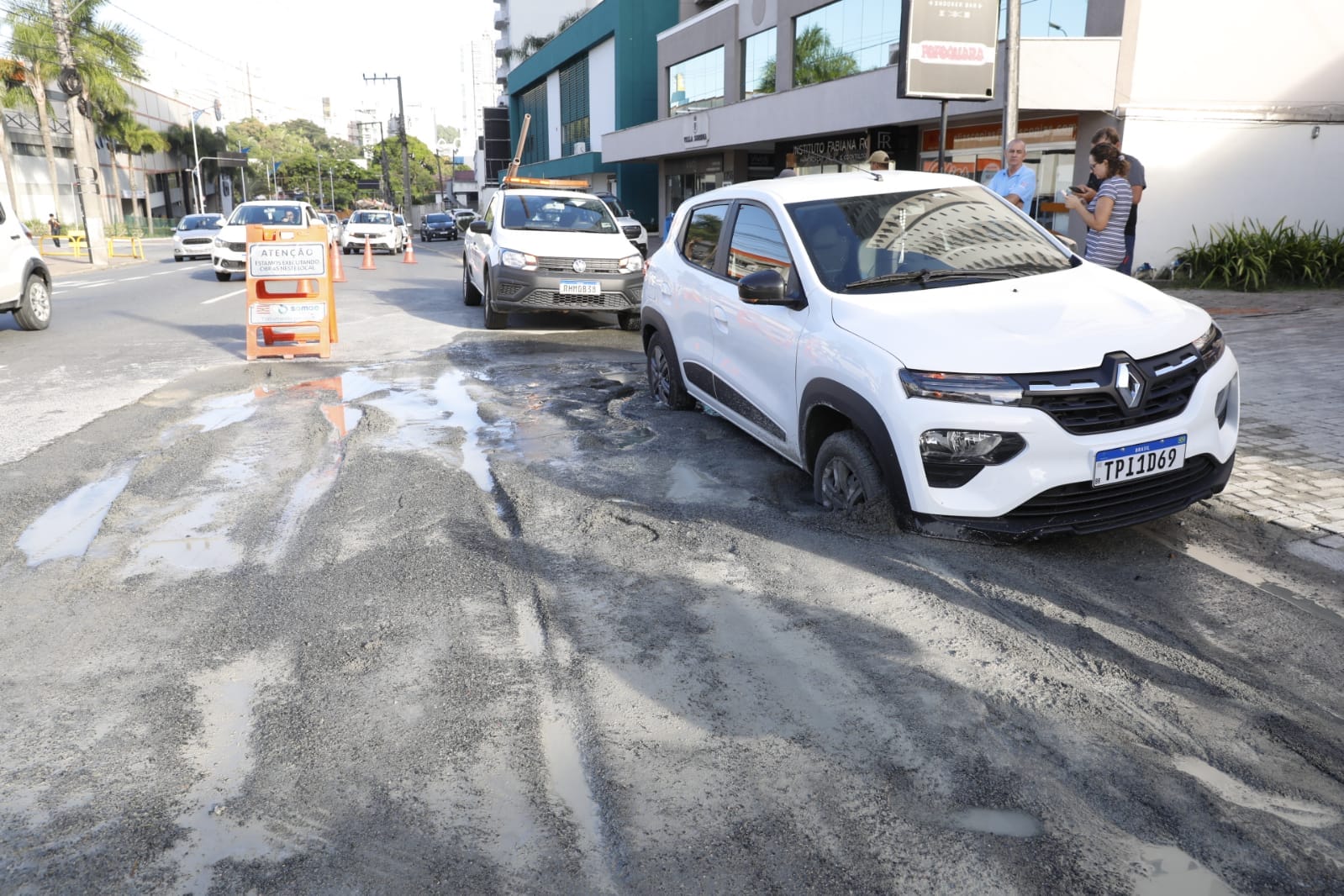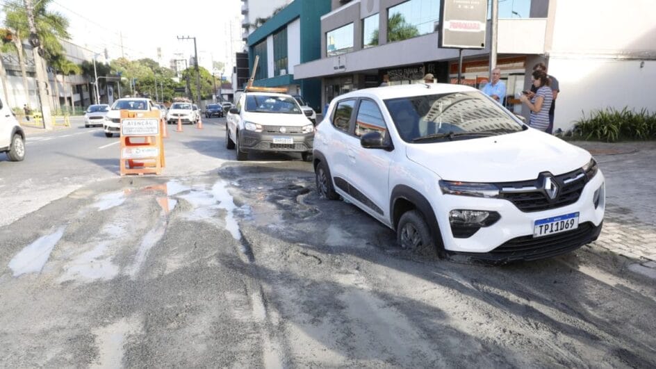 A segunda-feira (9) começou com uma dor de cabeça para uma motorista de Blumenau. O carro que ela conduzia afundou em um trecho da Rua São Paulo que passa por obras do Samae. O local no bairro Victor Konder, perto do Senai e Giassi, que cotidianamente é movimentado, ficou com o trânsito ainda mais intenso depois das 7h.