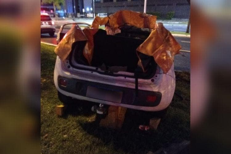 Uma pessoa ficou ferida após um carro bater em uma árvore na madrugada deste domingo (9) na Avenida Beira-Mar Norte, em Florianópolis. O carro ficou destruído com o impacto.