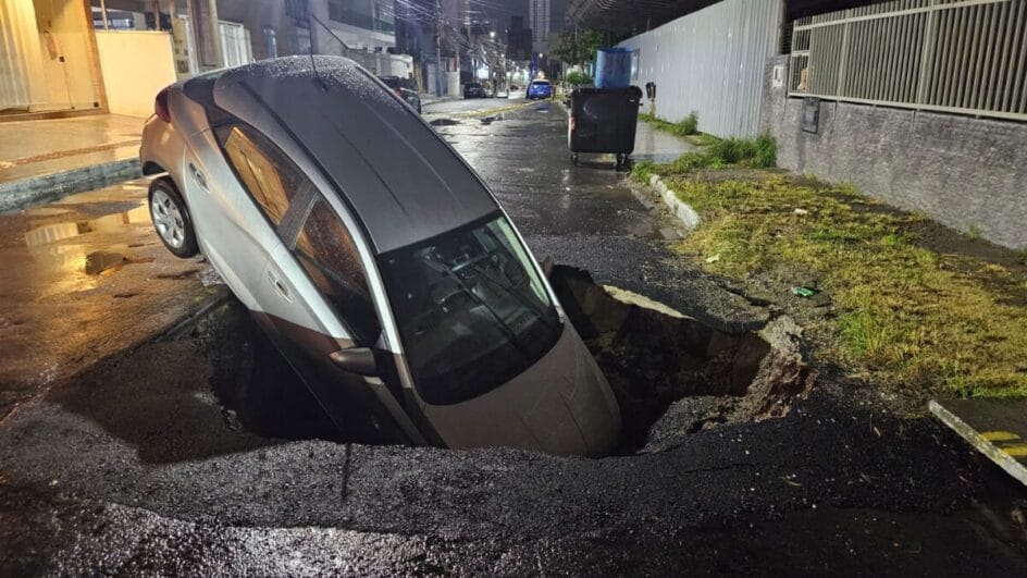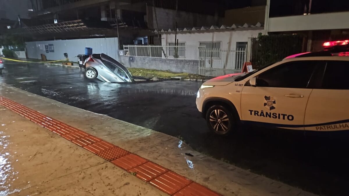 Um carro caiu em uma cratera que se abriu em uma rua de Balneário Camboriú por conta das fortes chuvas que atingiram a cidade na noite desta segunda-feira (6). Segundo a prefeitura, o motorista que conduzia o veículo não teve ferimentos.