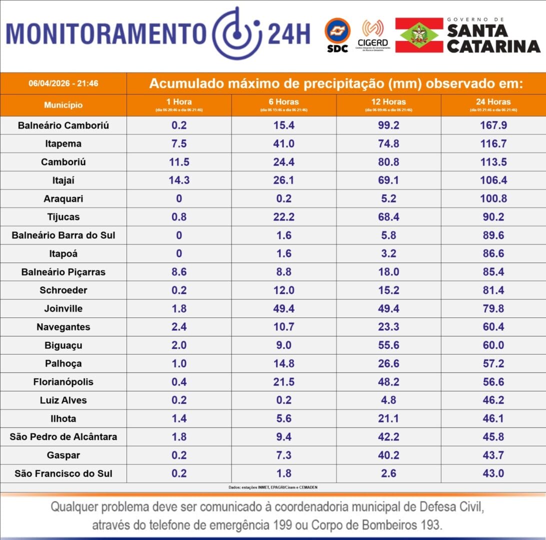 Segundo informações da Defesa Civil estadual, Balneário Camboriú registrou 167,9 milímetros de chuva nas últimas 24 horas, sendo o município com o maior acumulado no período em todo o Estado. Em seguida aparece Itapema, com 116,7 milímetros em 24 horas, e Camboriú, com 113,5 milímetros.