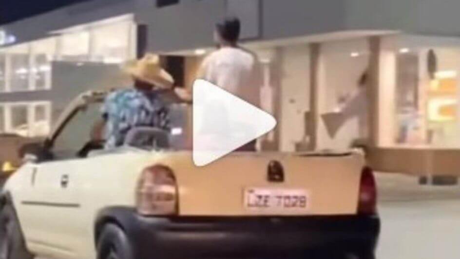 A Polícia Militar de Indaial flagrou uma série de irresponsabilidades no trânsito cometida por um motorista durante o fim de semana. As imagens publicadas no perfil da corporação mostram o dono de um Corsa transformando o veículo em conversível. Depois de pronto, ele dirige pela cidade com pessoas soltas na parte de cima do automóvel e ainda improvisa uma piscina no que seria a carroceria do carro.