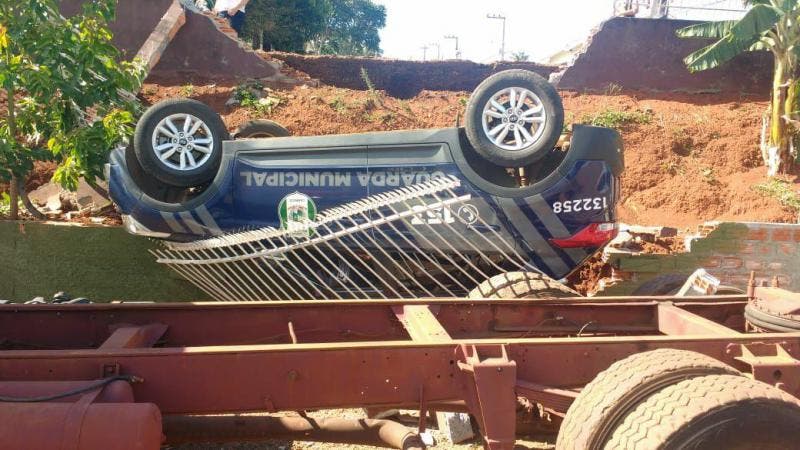 Uma viatura da Guarda Municipal de Chapecó, no Oeste de SC, capotou e invadiu o terreno de uma casa durante uma perseguição neste domingo à tarde. O caso ocorreu na região do bairro Passo dos Fortes, na Rua Inglaterra.