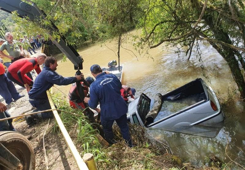 Segundo o capitão Marcos Colla, os mergulhadores dos bombeiros localizaram o carro a cerca de dois metros da ponte, na localidade de São Pedro do Timbó.