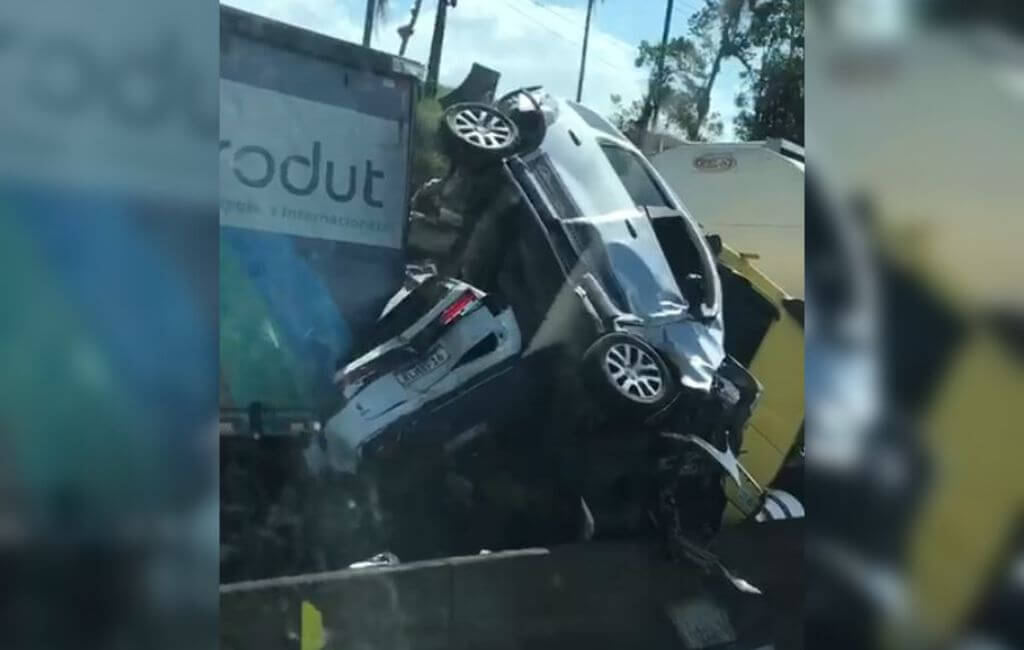 Um vídeo gravado por um motorista que passava pelo local mostra que os dois carros foram espremidos entre as carretas, que colidiram durante o engavetamento.