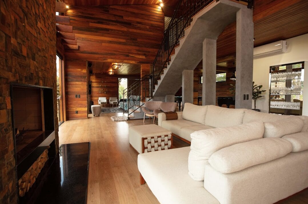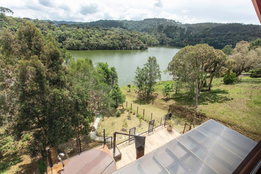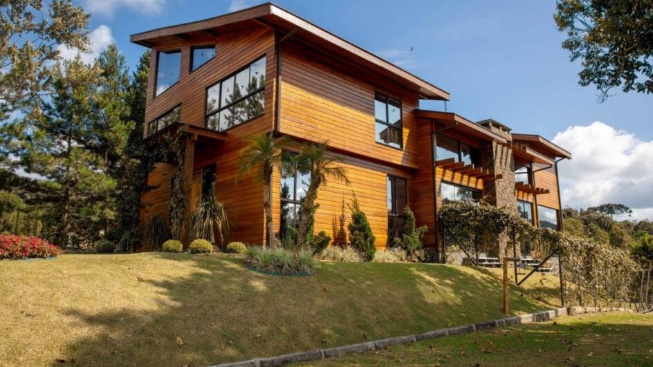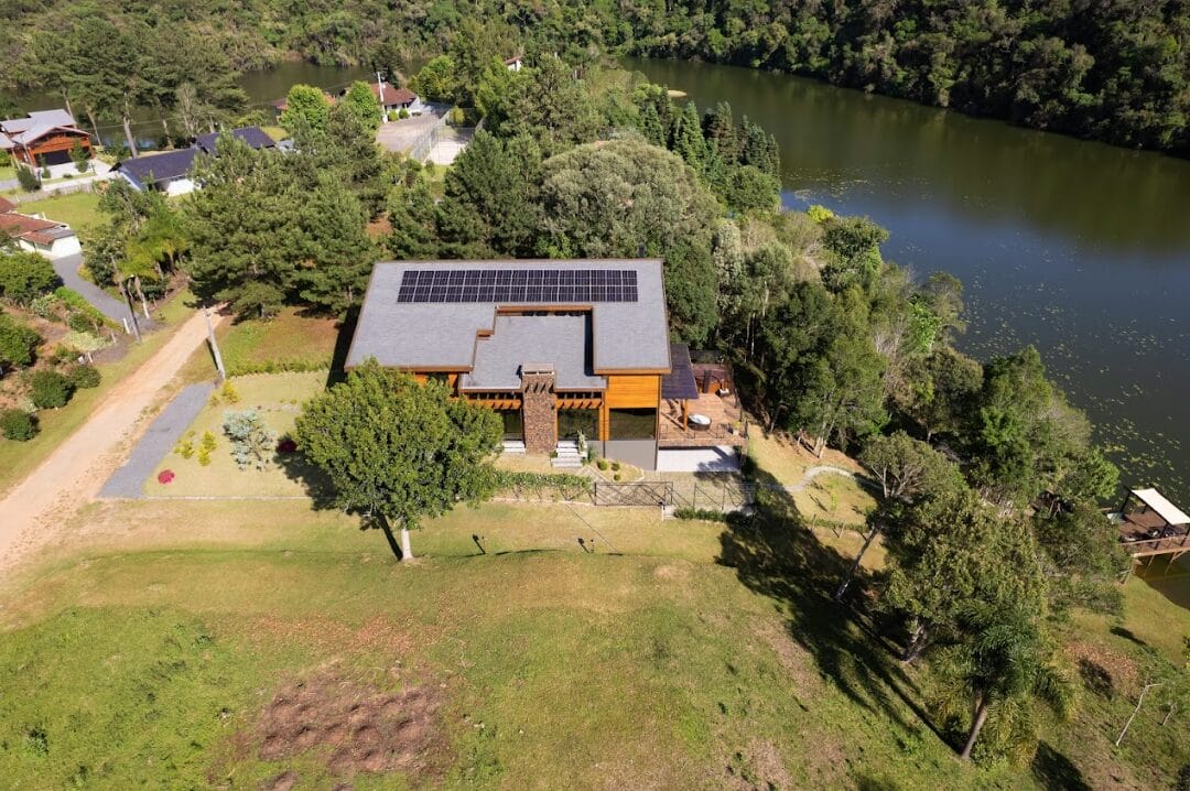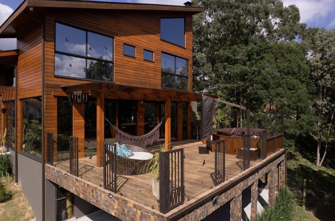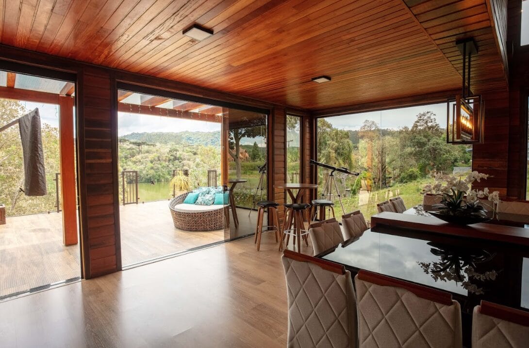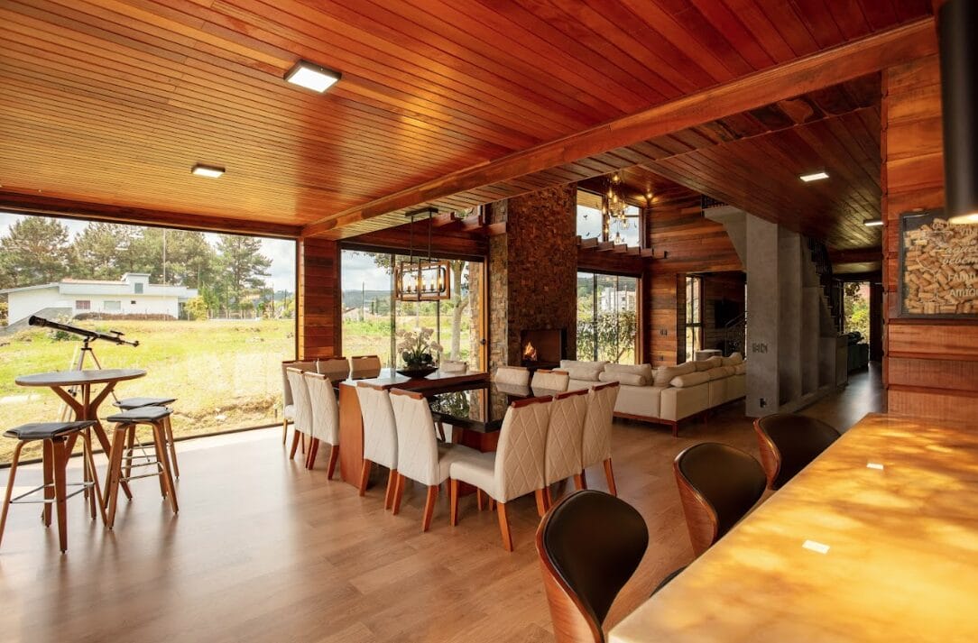 Um casarão imponente e cheio de charme está à venda em Rio dos Cedros, no Vale do Itajaí, por R$ 5,3 milhões. Localizado no condomínio Vivendas do Paraíso, o imóvel combina conforto, sofisticação e integração com a natureza às margens da represa da barragem do Pinhal. A casa foi construída com parte em alvenaria e outra em madeira nobre, com paredes duplas. São 500 metros quadrados de área construída.