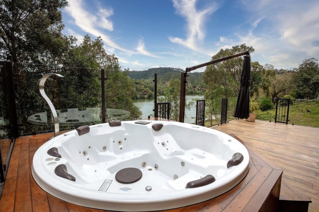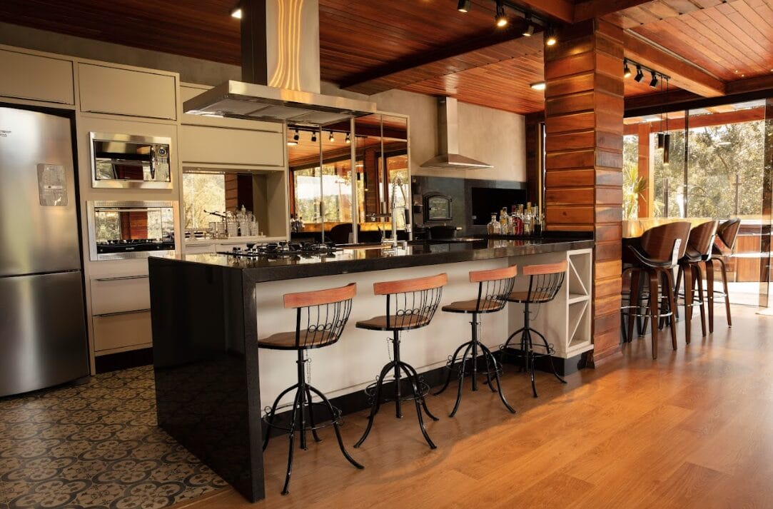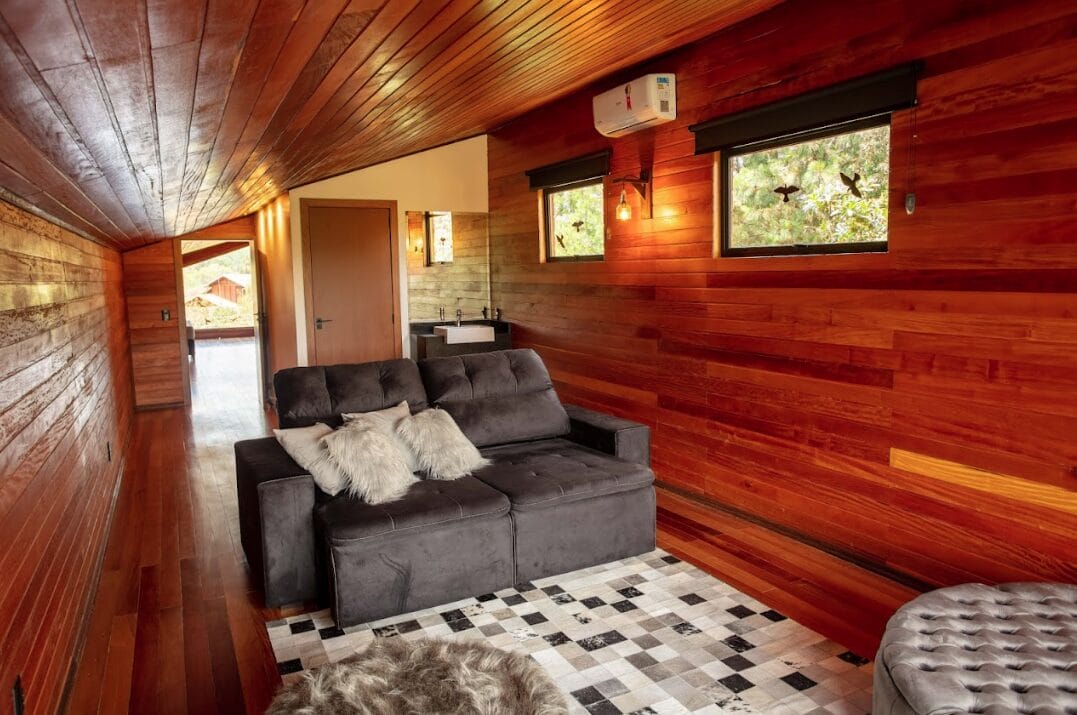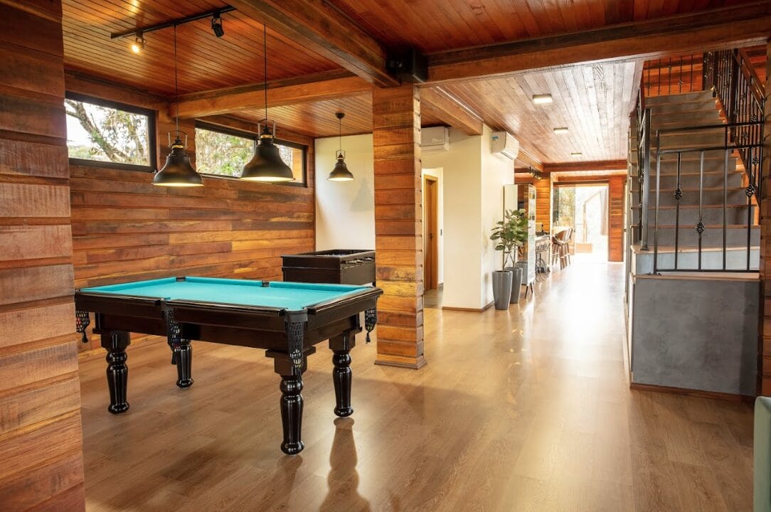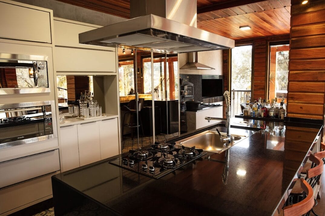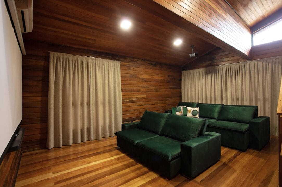 As cinco suítes e ambientes amplos em conceito aberto conseguem acomodar até 30 pessoas com sobra de espaço, garante o corretor responsável pela venda. O imóvel conta com cinema para oito telespectadores, sala de jogos, área gourmet, deck com jacuzzi integrada à sala de jantar e som ambiente independente. Para garantir a energia elétrica, a casa dispõe de gerador a gasolina e sistema com placas solares.
