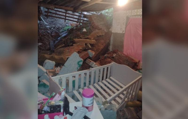 Na Rua Anita Garibaldi, no Centro da cidade, o teto de uma casa desabou e atingiu carros que estavam estacionados em frente a residência.