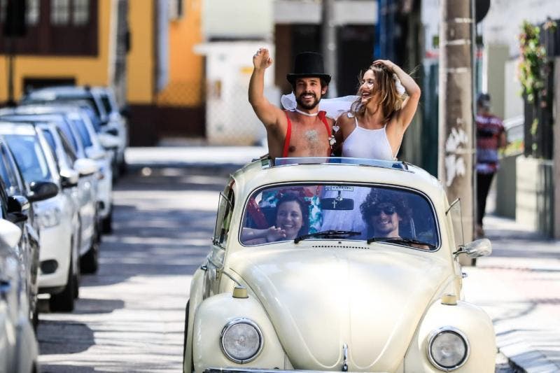 Em meio aos amigos e aos foliões, os dois chegaram de fusca na cerimônia e curtiram o momento especial com o clima carnavalesco que tanto os uniu. A união foi celebrada no bloco de rua Bicharada. O grupo teve concentração na avenida Hercílio Luz e agitou a região central da capital.