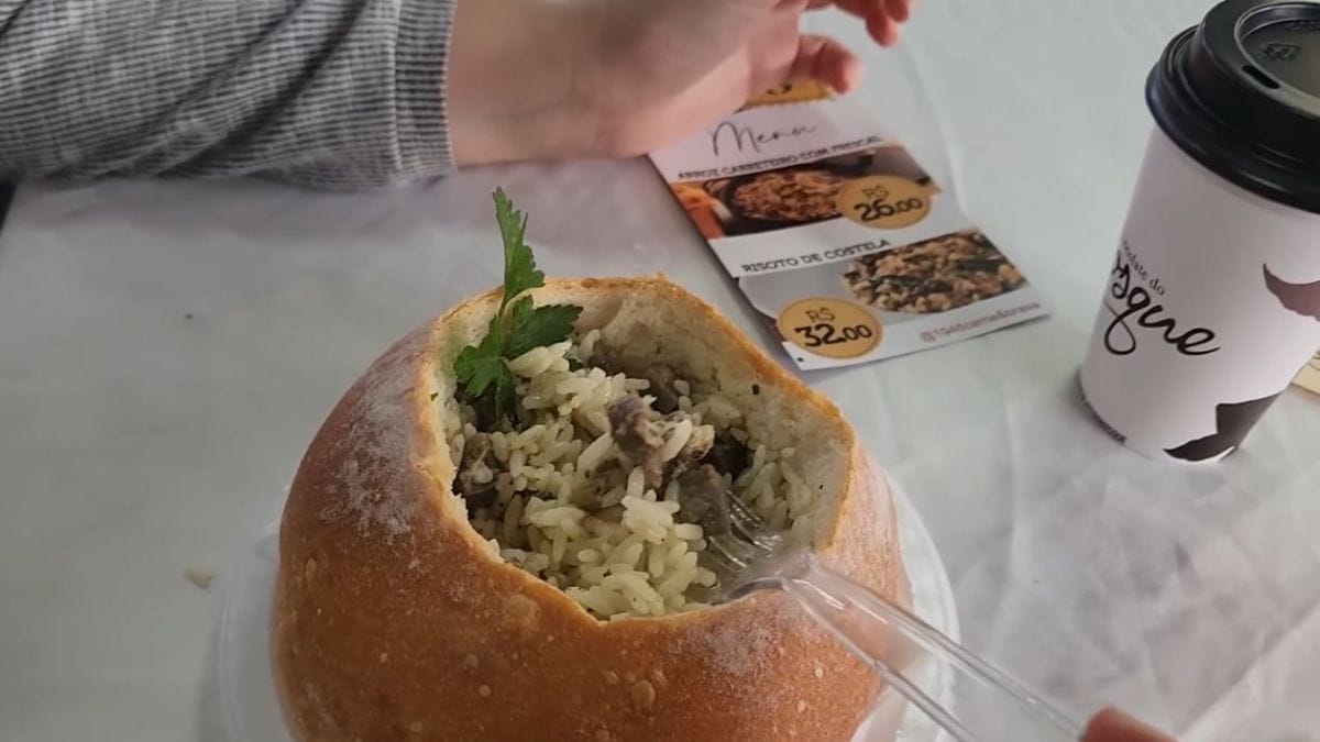 O casal, formado por Luíd e Stefane, elogiou a textura da carne e a combinação com o pão, ressaltando o sabor da farinha que acompanha o prato. Em seguida, os dois provaram uma sopa agnolini (capeletti), um tipo de macarrão recheado com frango, com um toque bem evidente de alho, que afirmaram ser muito saborosa e ideal para o clima frio.