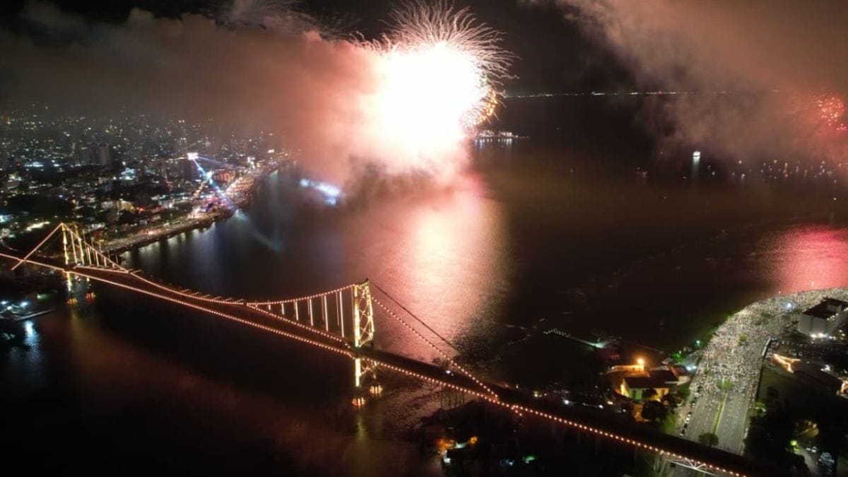 Ao olhar para cima, a multidão que lotou a Avenida Beira-mar Norte e a Beira-mar Continental, palcos do espetáculo do Ano Novo em Florianópolis, se encantou com o show de fogos de artifício. O espetáculo, com duração de 15 minutos, teve como tema a comemoração dos 100 anos da ponte Hercílio Luz, com uma cascata de fogos que maravilhou o público que contemplava a cena nos minutos finais da queima de fogos.
