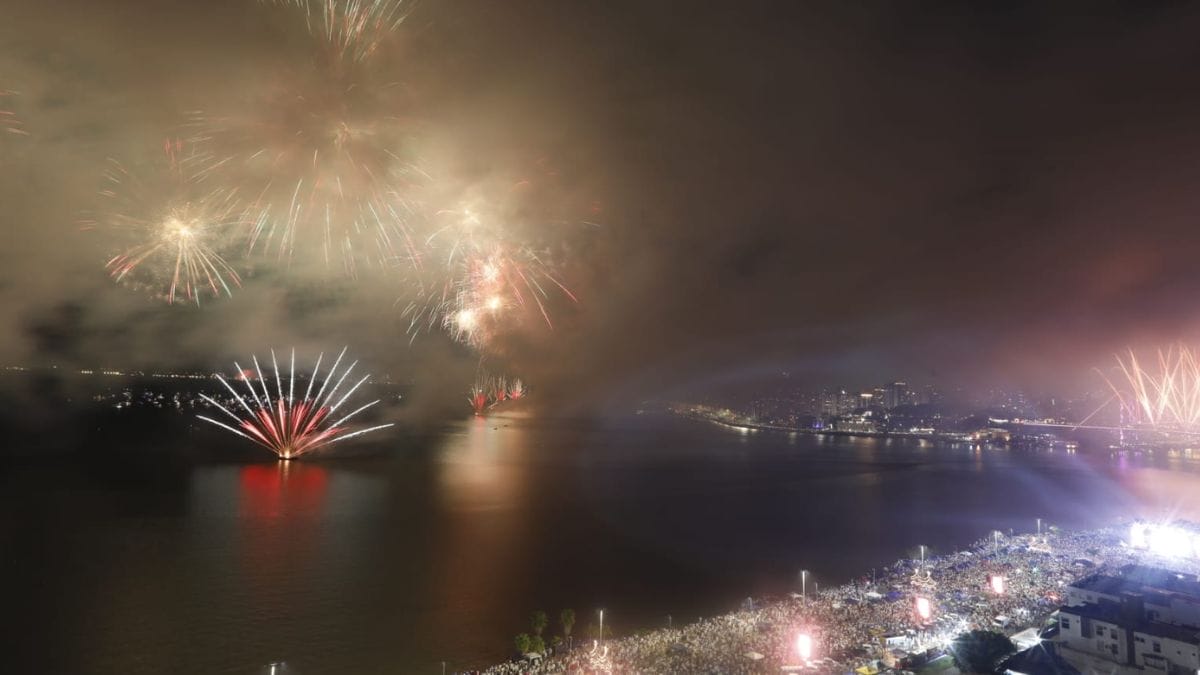 Ao som de um mix de músicas, o público ficou maravilhado ao contemplar o espetáculo de luzes, com gritos e assovios de admiração para a beleza da queima de fogos. Entre abraços e desejos de “um Feliz Ano Novo”, famílias e amigos se olharam com felicidade e esperança para que 2026 fosse um ano tranquilo. Era só isso o que se ouvia entre a multidão, com champanhes estourando.