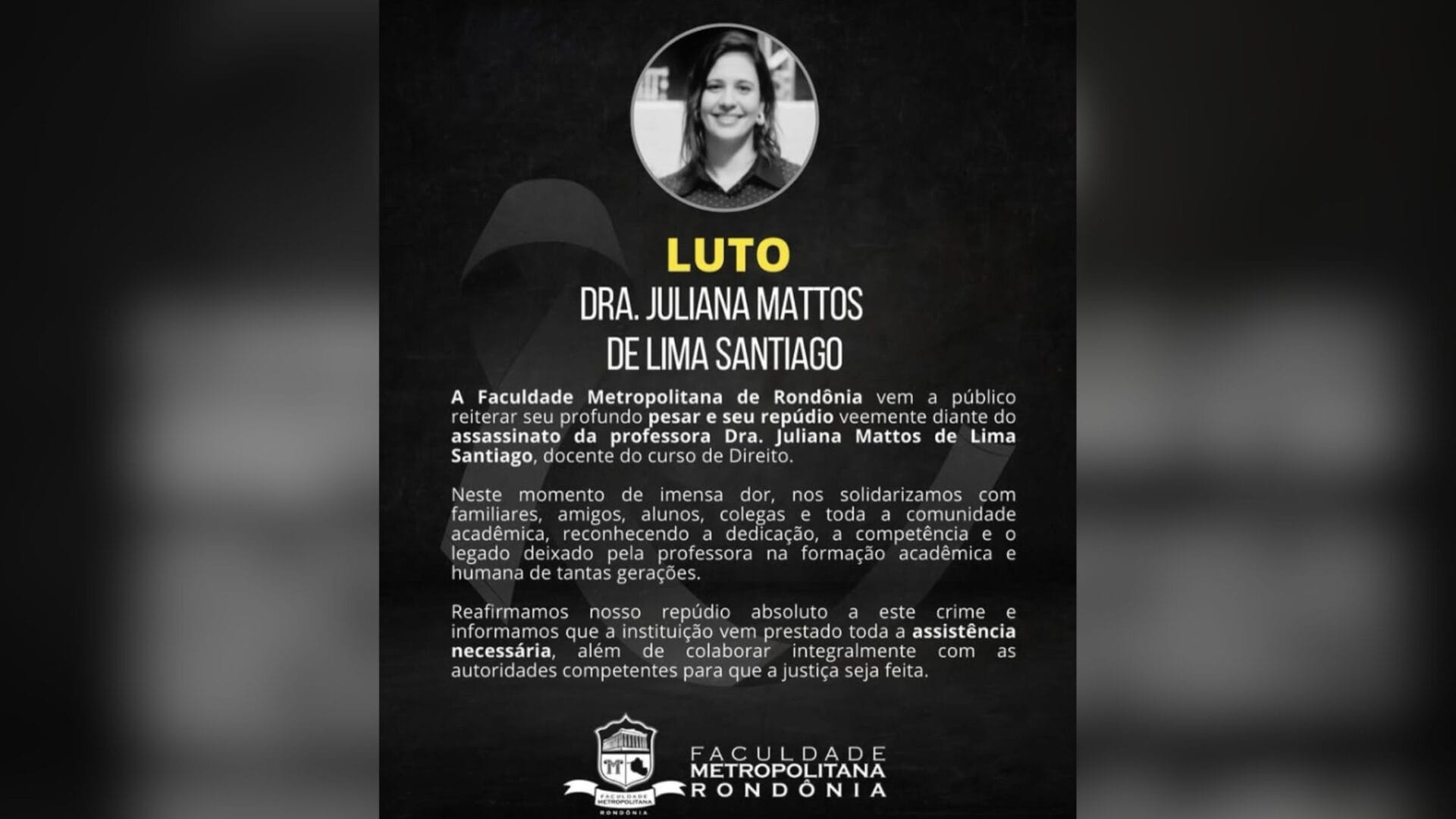 “A perda da dra. Juliana Mattos, uma docente dedicada, competente e amada por alunos e colegas, deixa um vazio irreparável em nossa comunidade acadêmica. Sua paixão pelo ensino jurídico e seu compromisso com a formação de novas gerações serão sempre lembrados com carinho e gratidão”, publicou a faculdade.