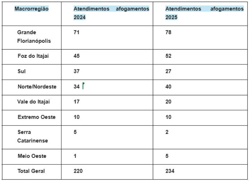 O número de ocorrências de afogamento atendidos pelo Samu em Santa Catarina aumentou 36,6% na temporada de verão 2025-2026 em comparação com a temporada passada. Entre dezembro de 2025 e março de 2026, foram registrados 138 casos. No verão anterior, o total foi de 101 ocorrências.