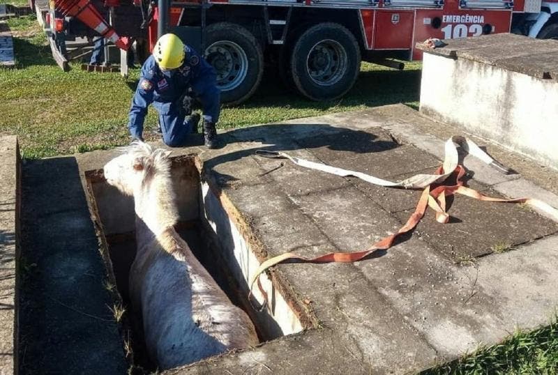 Um cavalo precisou res resgatado pelos bombeiros após cair dentro de um túmulo aberto no cemitério municipal de Mafra, no Planalto Norte de Santa Catarina. O caso aconteceu por volta das 9h30 do último domingo (23).