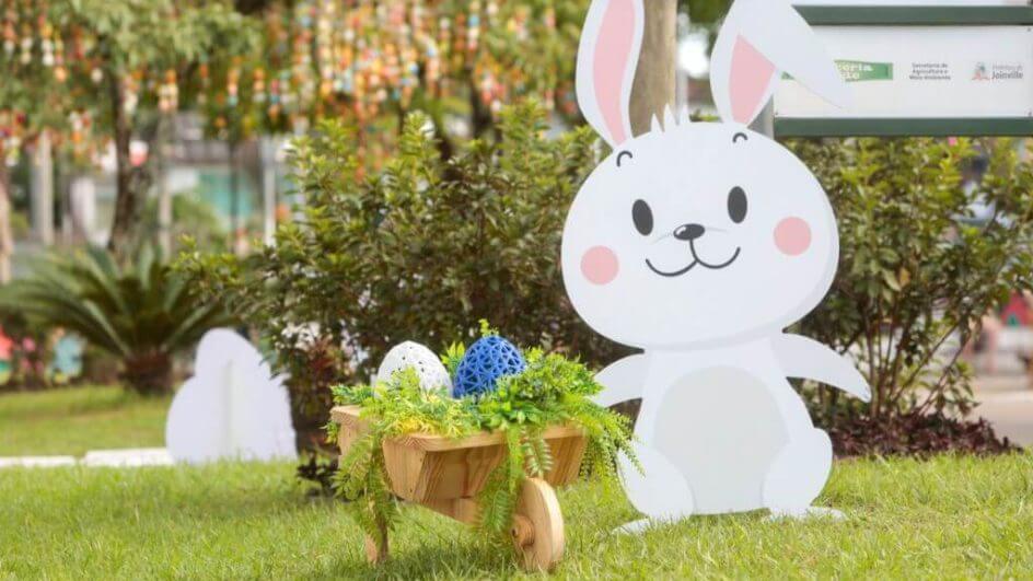 O espaço, na Praça Lauro Muller, está enfeitado com ovinhos e coelhos coloridos.
