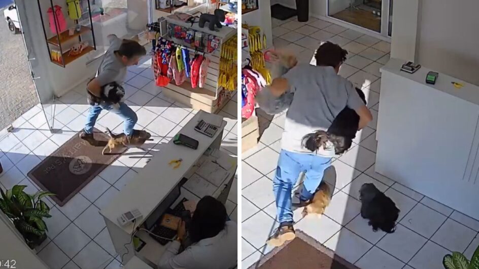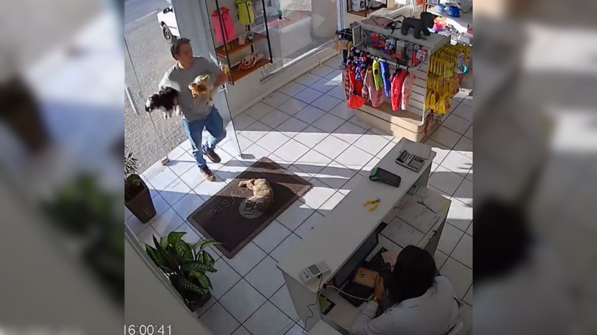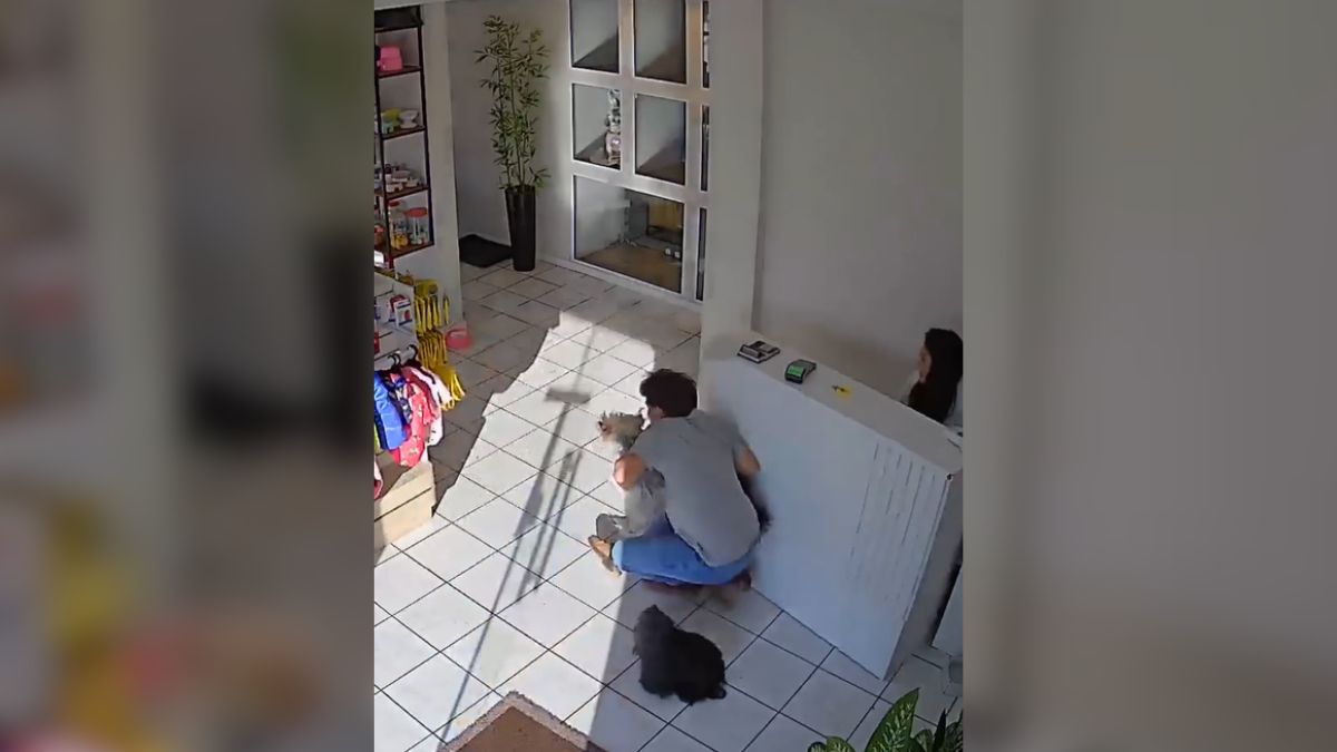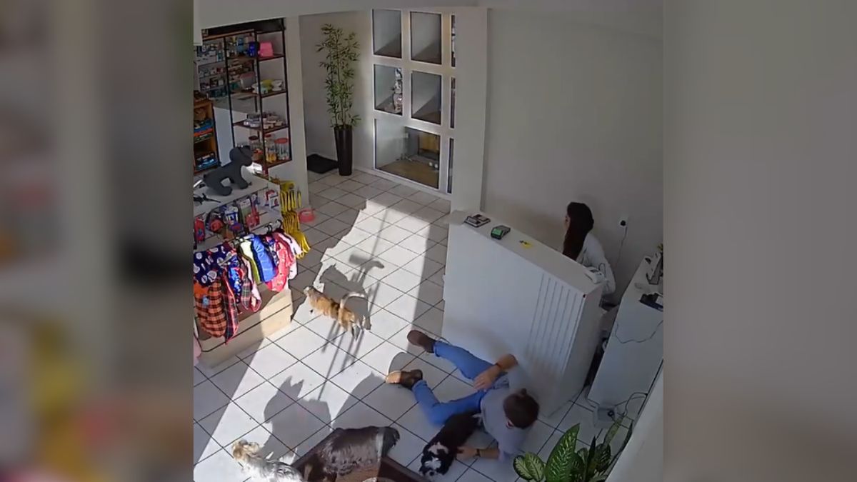 Na imagem é possível ver quando um homem, que carrega dois cachorros no colo, entra no estabelecimento sem ver o gato deitado no tapete. Ele tropeça no felino, que sai correndo, derruba os cachorros e cai no balcão da loja. Outro fator que chamou a atenção dos internautas foi a reação da atendente, que começou a rir da situação.
