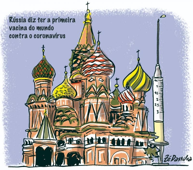 A charge de Zé Dassilva desta terça-feira (11) trata da Rússia ter registrado a primeira vacina contra o coronavírus no mundo. No Início do mês, o governo do país já havia dito que pretendia distribuir as doses à população até outubro