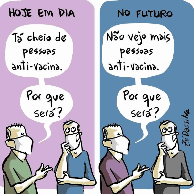 A charge do Zé Dassilva desta segunda-feira (7) trata das pessoas que não se vacinaram contra a Covid-19, que hoje representam a maior porcentagem de hospitalizados pela doença.