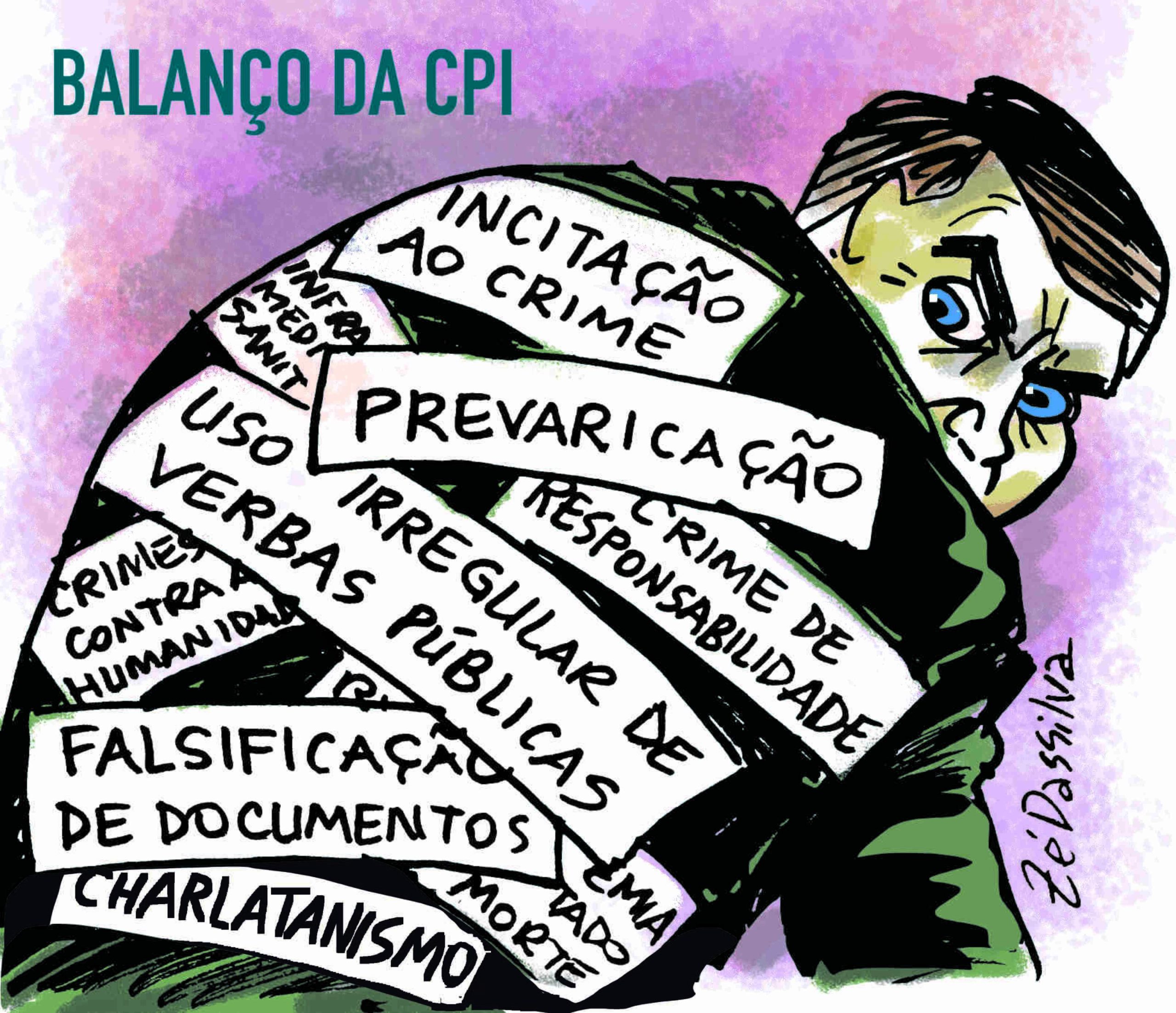 A charge do Zé Dassilva desta quarta-feira (20) trata da CPI da Covid, que, em relatório final, pediu o indiciamento do presidente Jair Bolsonaro por nove crimes.