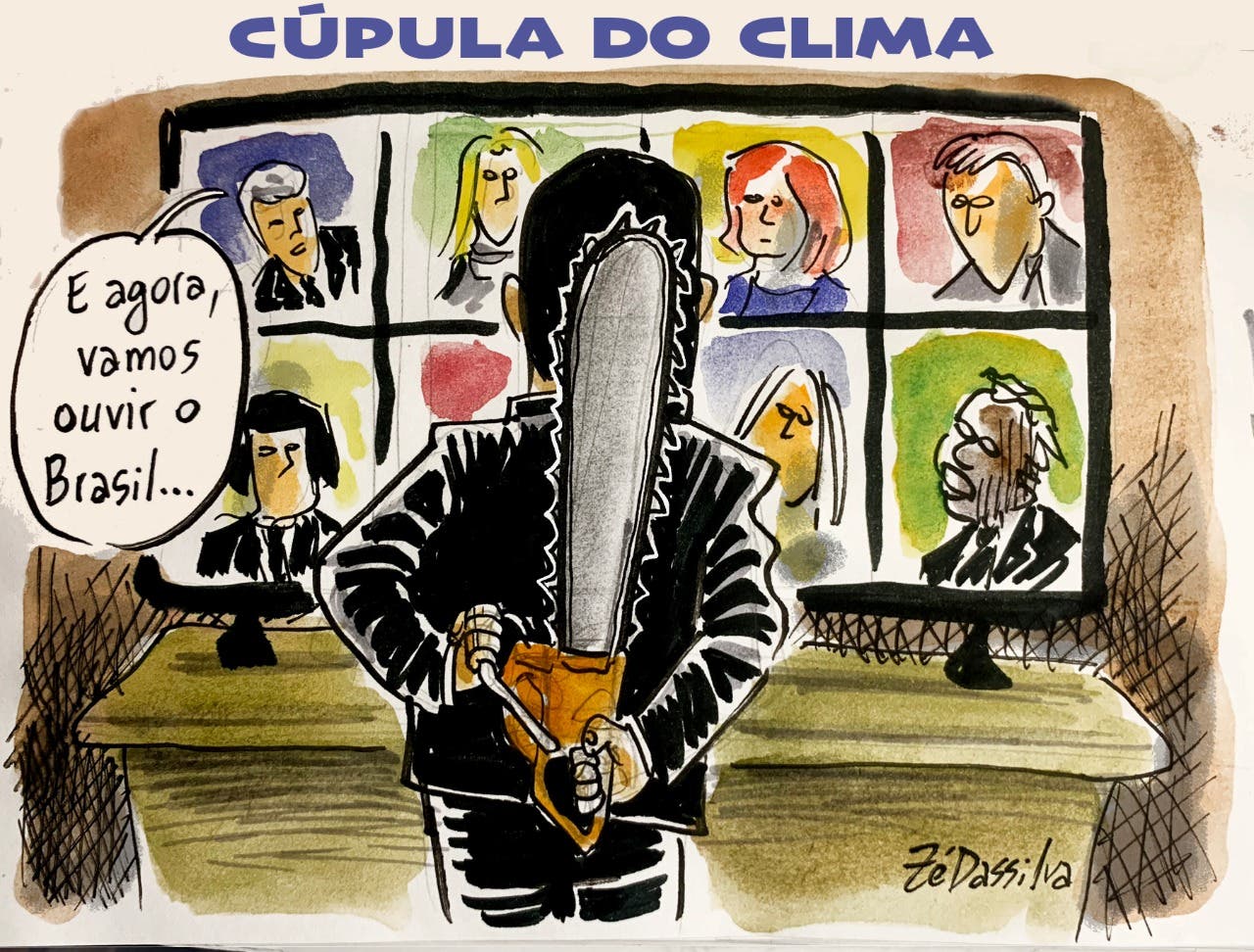 A charge do Zé Dassilva desta quarta-feira (21) trata da Cúpula de Líderes sobre o Clima, evento organizado por Joe Biden, presidente dos Estados Unidos, que tem o objetivo de discutir ações de enrentamento à crise global das mudanças climáticas.