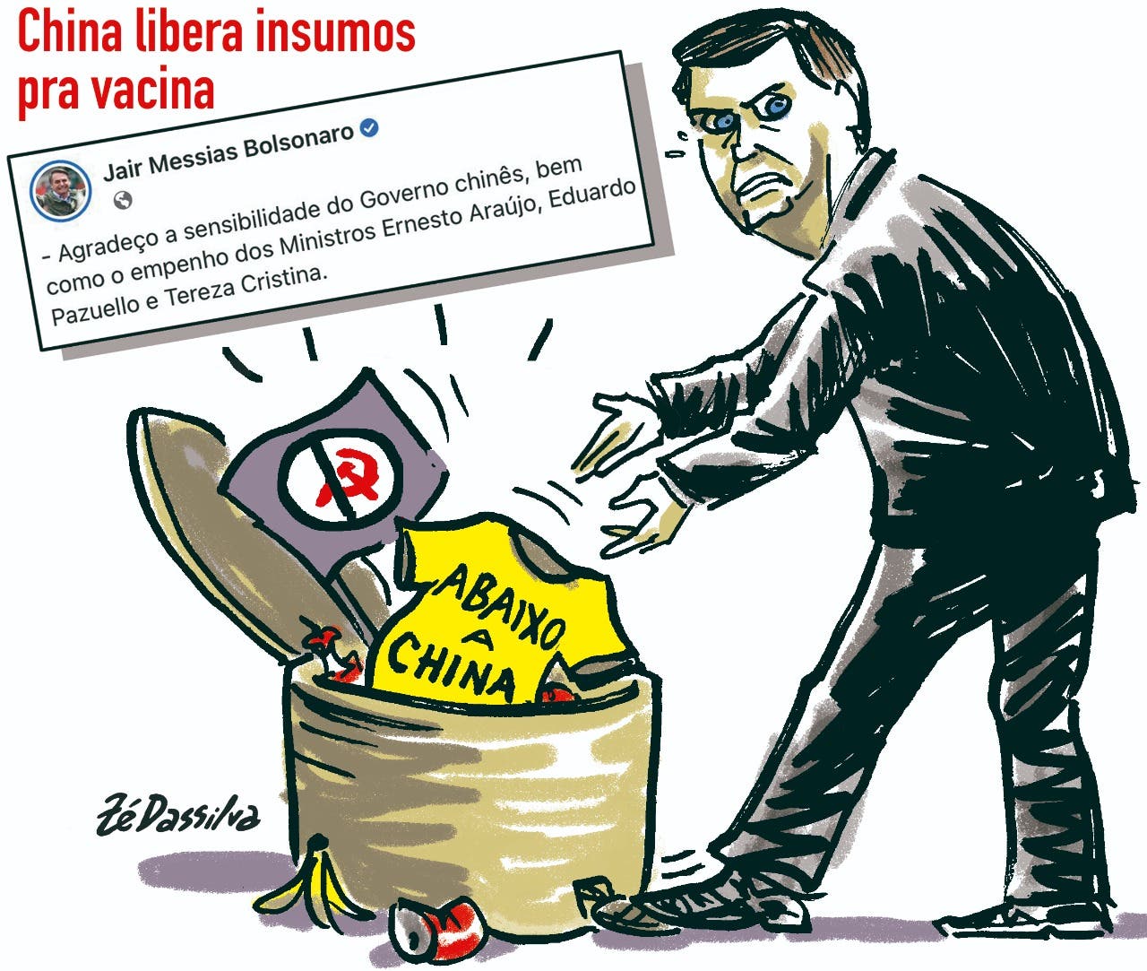 A charge do Zé Dassilva desta segunda-feira (25) trata da mudança do discurso do presidente Jair Bolsonaro (sem partido) quanto à China, para que o país asiático libere o envio de insumos para a fabricação das vacinas contra a Covid-19 ao Brasil.