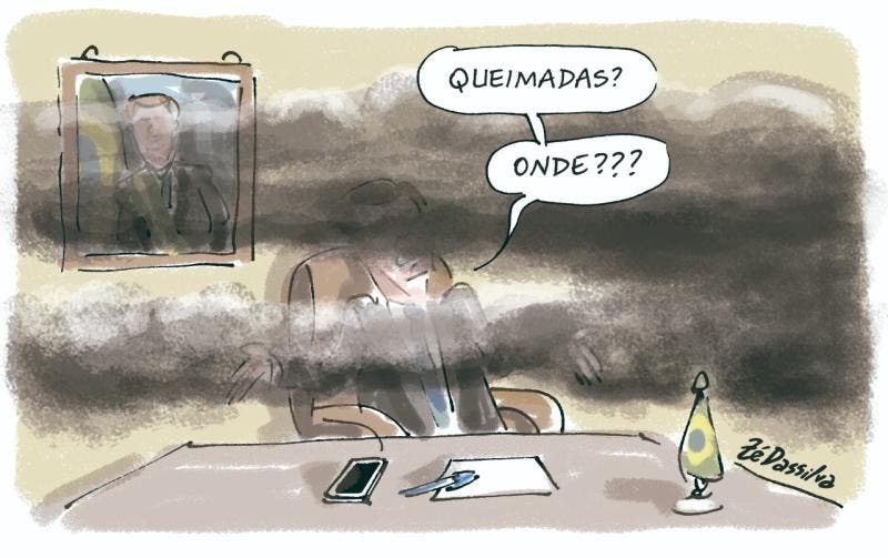 A charge de Zé Dassilva desta segunda-feira (14) trata do silêncio do presidente Jair Bolsonaro (sem partido) quanto às queimadas no Pantanal, no sudoeste do Brasil. Até a cantora Anitta já cobrou um posicionamento do presidente.