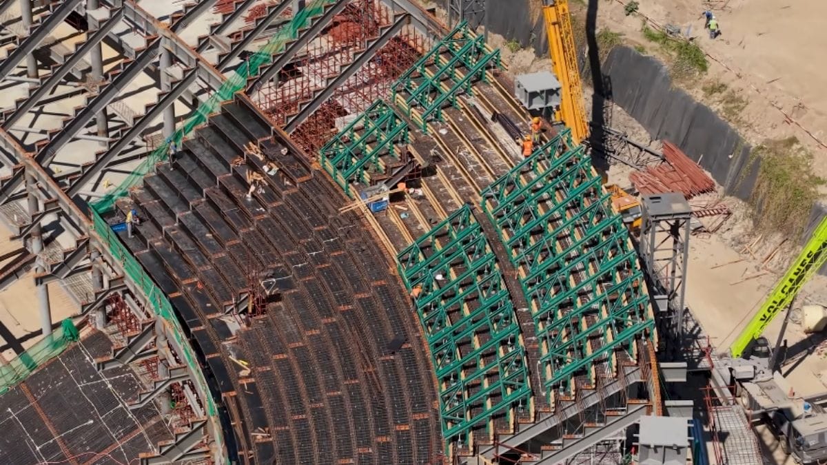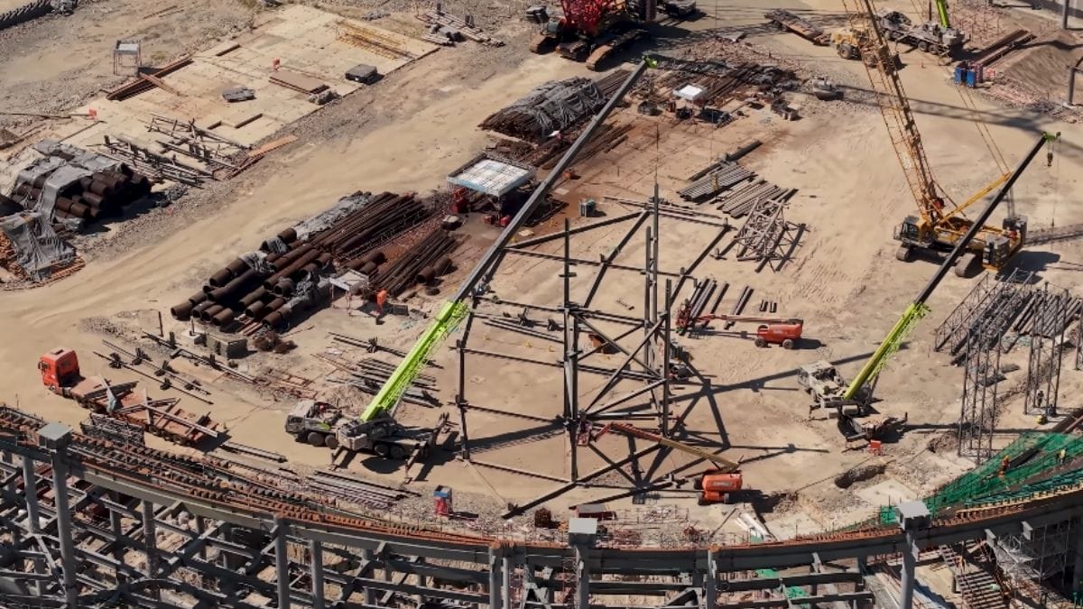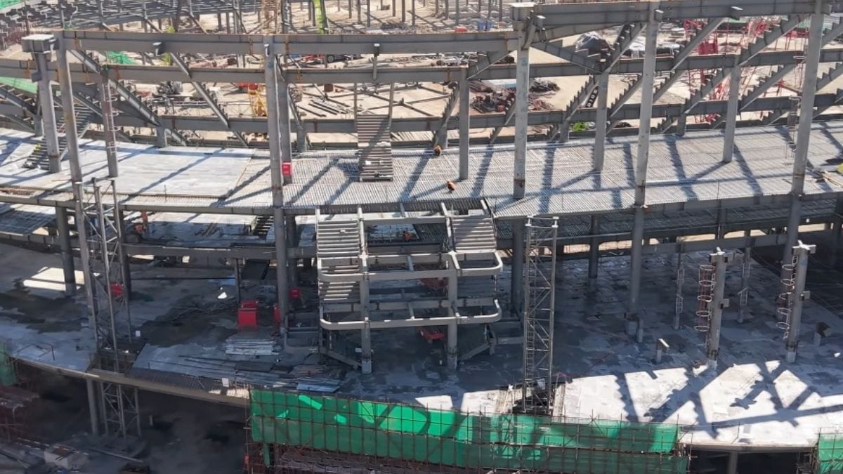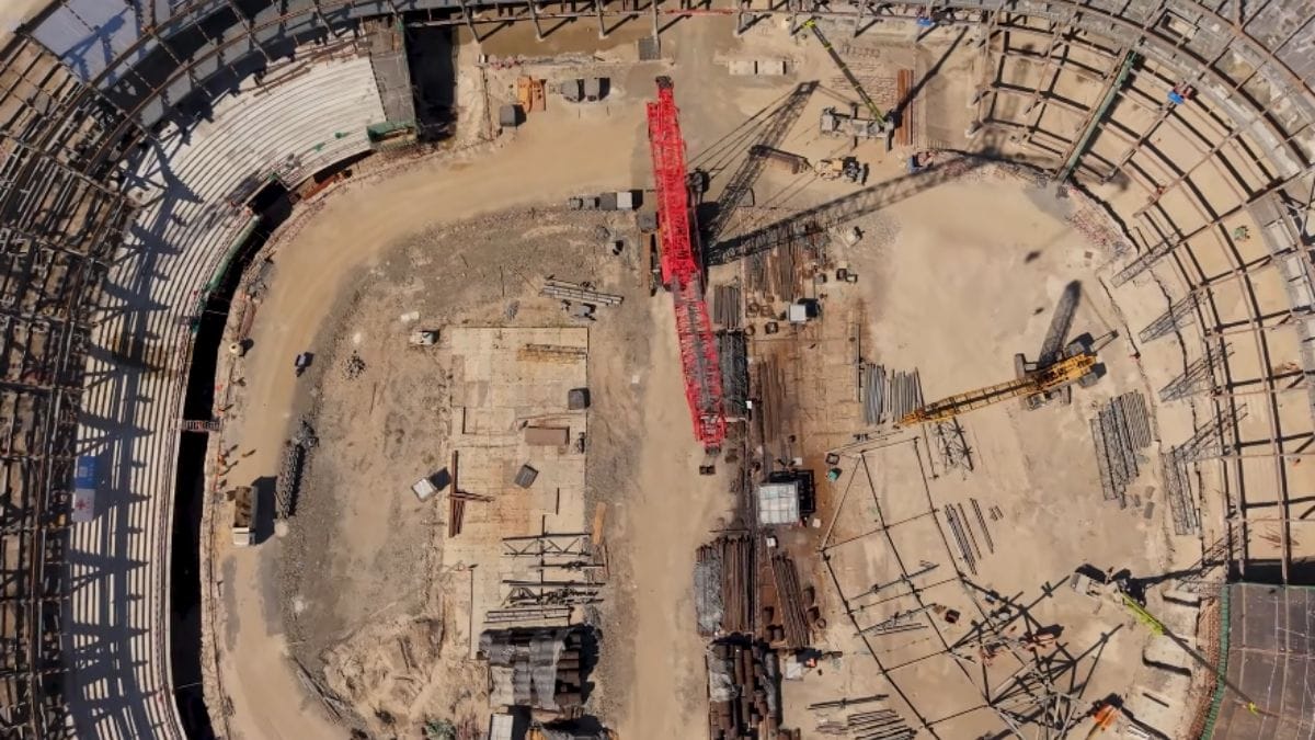 Nas últimas semanas, a construção avançou de forma significativa. De acordo com a China State Construction Engineering Corporation (CSCEC), empresa de construção estatal chinesa, as arquibancadas, feitas em um sistema de estrutura de aço, foram içadas e alinhadas.