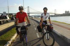 Após pedalar 23 dias a partir de Buenos Aires, a dupla da organização Biciactivistas chegou em Florianópolis na tarde desta quarta-feira. Os dois ciclistas, o arquiteto argentino Julian Grobe, de 28 anos, e o urbanista francês Nicolas Dubois, de 25 anos, querem chegar ao Rio de Janeiro de bike e no percurso conhecer a situação da mobilidade ciclística em mais de 50 cidades.