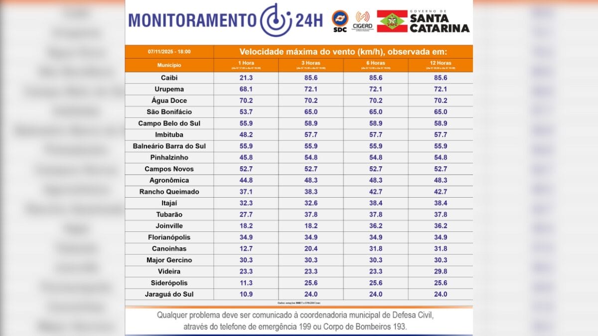 Outras cidades registraram ventos fortes nesta sexta-feira. Em Urupema, por exemplo, na Serra catarinense, a ventania chegou aos 72 km/h. Em Água Doce, no Oeste, os ventos também passaram dos 70 km/h nas últimas 12 horas.