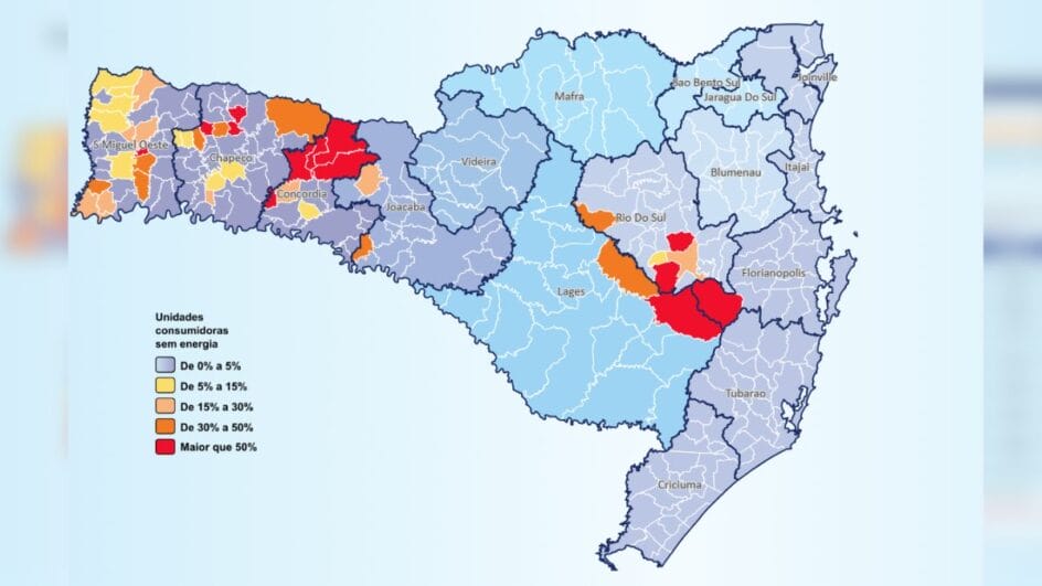 Em meio ao ciclone que atinge Santa Catarina nesta sexta-feira (7), pelo menos 64 mil unidades consumidoras sem luz por volta das 18h30min, de acordo com o painel da Celesc. A região Oeste é a mais afetada, com municípios como Faxinal dos Guedes e Ponte Serrada com quase todas as casas sem luz. Alfredo Wagner, Petrolandia e Bom Retiro, entre a Serra e a Grande Florianópolis, também estão com a maioria das unidades sem luz.