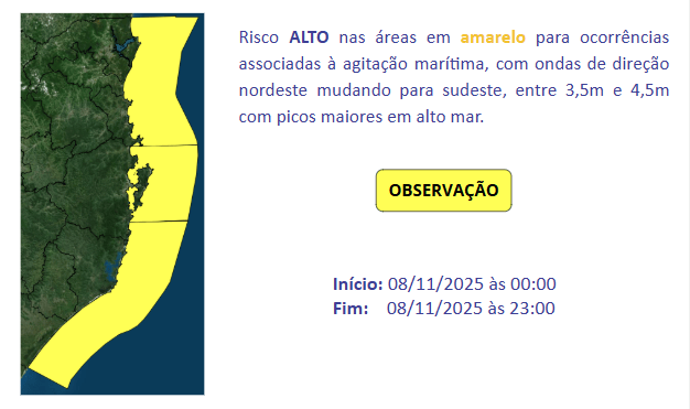 Além dos ventos, o mar deve ficar muito agitado no sábado, com ondas que podem ultrapassar 4,5 metros entre o Litoral Sul e a Grande Florianópolis. A recomendação é evitar atividades de navegação, pesca, esportes marítimos e caminhar na orla em locais onde as ondas atinjam a faixa de areia ou ciclovias.
