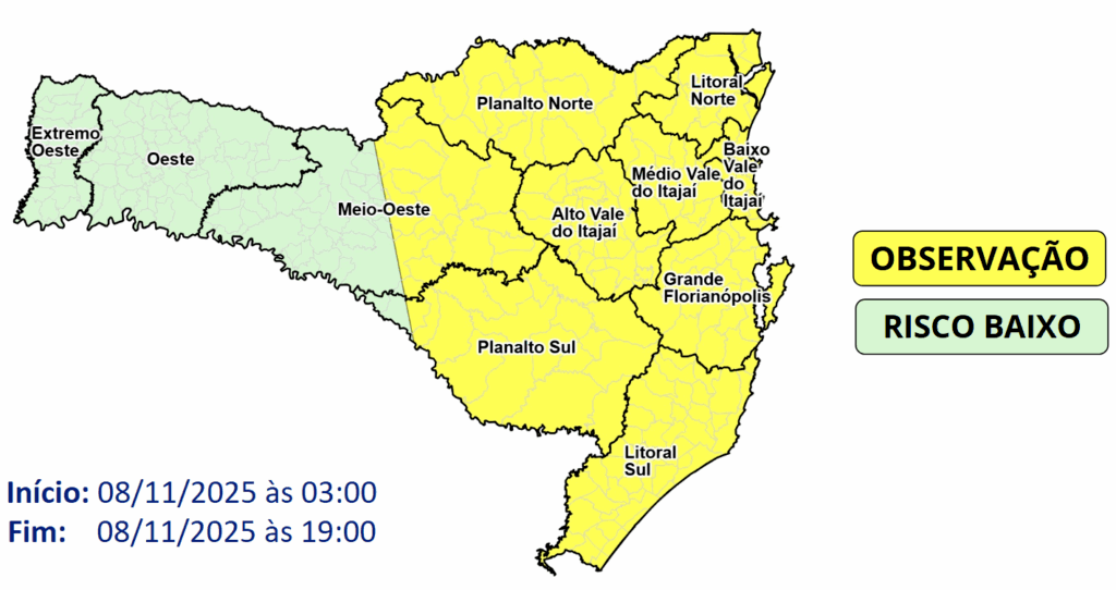 “A Secretaria de Proteção e Defesa Civil de Santa Catarina intensifica o monitoramento das condições meteorológicas e o envio de alertas para a população. De forma preventiva, já foram distribuídos itens de assistência humanitária — como lonas e materiais de apoio — para prefeituras e unidades do Corpo de Bombeiros em todo o estado.