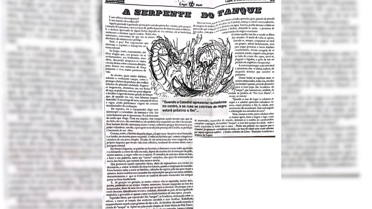 “A mãe solteira, para encobrir o fruto de sua vergonha, jogara a criança naquele tangue. Estranhamente, todavia, a criança não morrera, transformando-se em uma cobra. A cabeça da serpente ficara ali e a cauda se encontrava no carahá, estendida em todo o seu percurso… Nossa Senhora, ciente do crime praticado pela mãe, procurava evitar que a criança se revelasse ao mundo, prendendo, com os pés, a cabeça da hidra… O dia, porém, em que a santa padroeira abandonasse esse propósito, a cidade seria totalmente tomada pelas águas, escapando, entretanto, à enchente a cacimba da Santa Cruz” diz um trecho da obra.