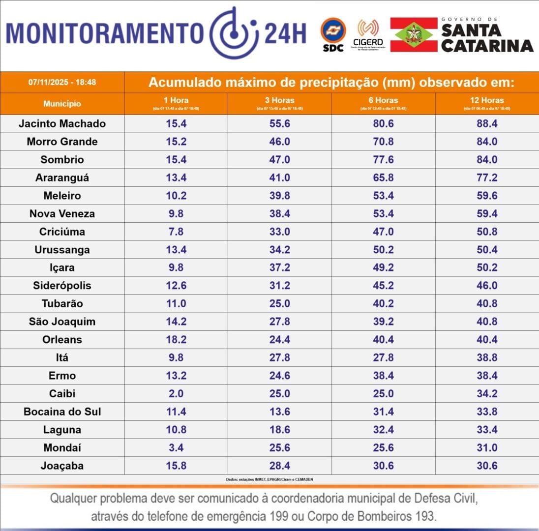 O levantamento da Defesa Civil mostra o quanto choveu entre às 6h48min e às 18h48min desta sexta. Depois de Jacinto Machado aparecem Morro Grande (84 mm), Sombrio (84 mm), Araranguá (77,2 mm), Meleiro (59,6 mm) e Nova Veneza (59,4 mm).