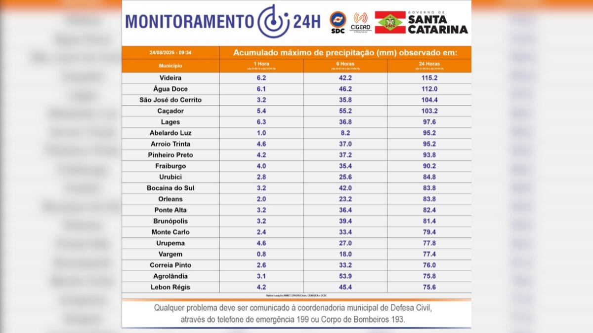 Conforme o órgão estadual, os maiores acumulados de chuva foram registrados em Videira, Água Doce, e Caçador, no Meio-Oeste, com 145 milímetros, 140 milímetros e 139 milímetros, respectivamente, registrados nas últimas 48 horas.