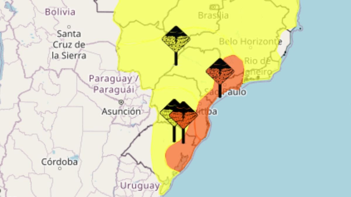 De acordo com o alerta do Inmet, parte de Santa Catarina, Paraná, São Paulo, Minas Gerais e o Sul do Rio de Janeiro podem sofrer com chuvas entre 30 e 60 milímetros por hora ou 50 a 100 milímetros por dia.
