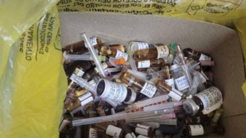 Também foram localizadas no estabelecimento três caixas para descarte hospitalar de material perfurocortante, com seringas, ampolas, fios de sustentação e frascos — todos com as embalagens rompidas. Outros produtos irregulares, sem identificação, também estavam guardados no local.
