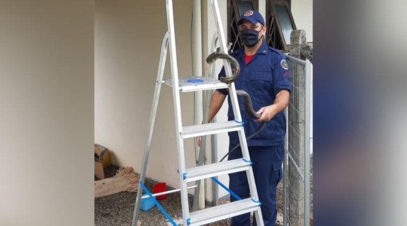 A cobra é da espécie canina e pode chegar a 2,5 metros. Apesar de assustar pelo tamanho, não é venenosa, dizem os bombeiros. O animal foi devolvido à natureza.