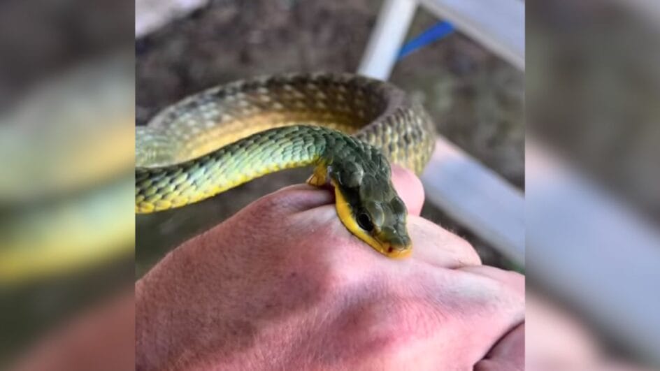 Para conseguir tirar a cobra-cipó do local, o biólogo usou um instrumento improvisado: uma vassoura. Após descer o animal, ele a pegou com as mãos e, neste momento, recebeu uma mordida. Destaca-se que a cobra-cipó não é peçonhenta, entretanto, a mordida dela pode causar infecções, caso a região da picada não seja limpa.